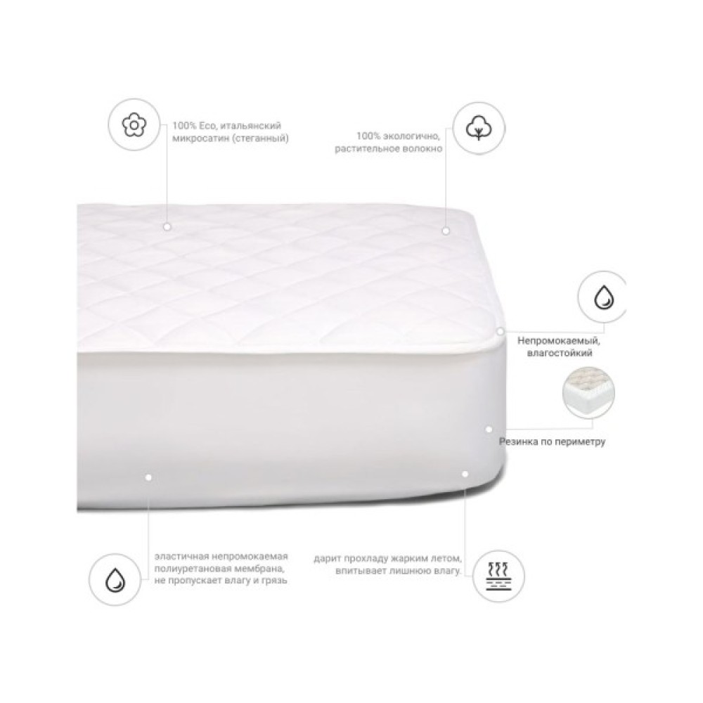 Сам наматрацник виготовлений із високоякісної тканини мікросатин виробництва Італії. Наматрацник витримує більш ніж 250 прань і водночас зберігає свій первинний вигляд. Тканина мікросатин ніжна, приємна на дотик, сатинове плетення забезпечує довговічність і м'якість усього виробу загалом. Наматрацник не ковзає по матрацу, добре фіксується. Наматрацник не пропускає вологу та здатний утримати до 0,5 л. І, на відміну від інших непромокальних наматрацників, він практично не шарудить, завдяки непромокальній еластичній мембрані.