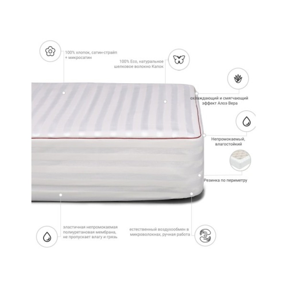 Наматрацник на гумці з високоякісної італійської тканини класу "DeLuxe". Тканина має назву "Сатин-страйп Італія", яка є довговічною, складається виключно зі 100% високоякісного бавовняного волокна. Сатинова тканина чохла має складне, жакардове переплетення, що надає наматрацнику не тільки високоестетичну вишуканість, але і збільшує міцність тканини загалом.