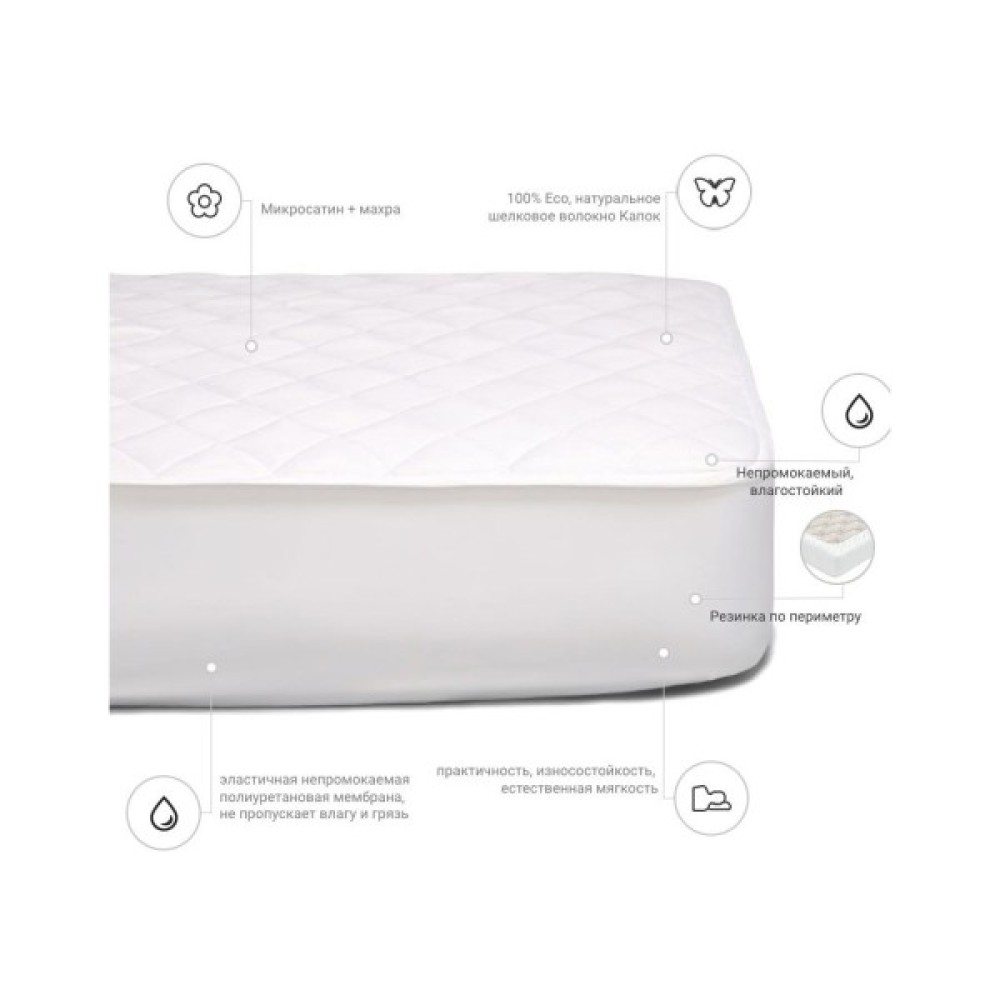 Одна сторона наматрацника виготовлена з високоякісної тканини мікросатин — виробництва Італія. Тканина мікросатин — ніжна, приємна на дотик, сатинове плетіння забезпечує довговічність і м'якість усього виробу загалом. Мікросатин подарує благодатну прохолоду спекотним літом, вбираючи зайву вологу. Наматрацник не ковзає по матрацу, добре фіксується.