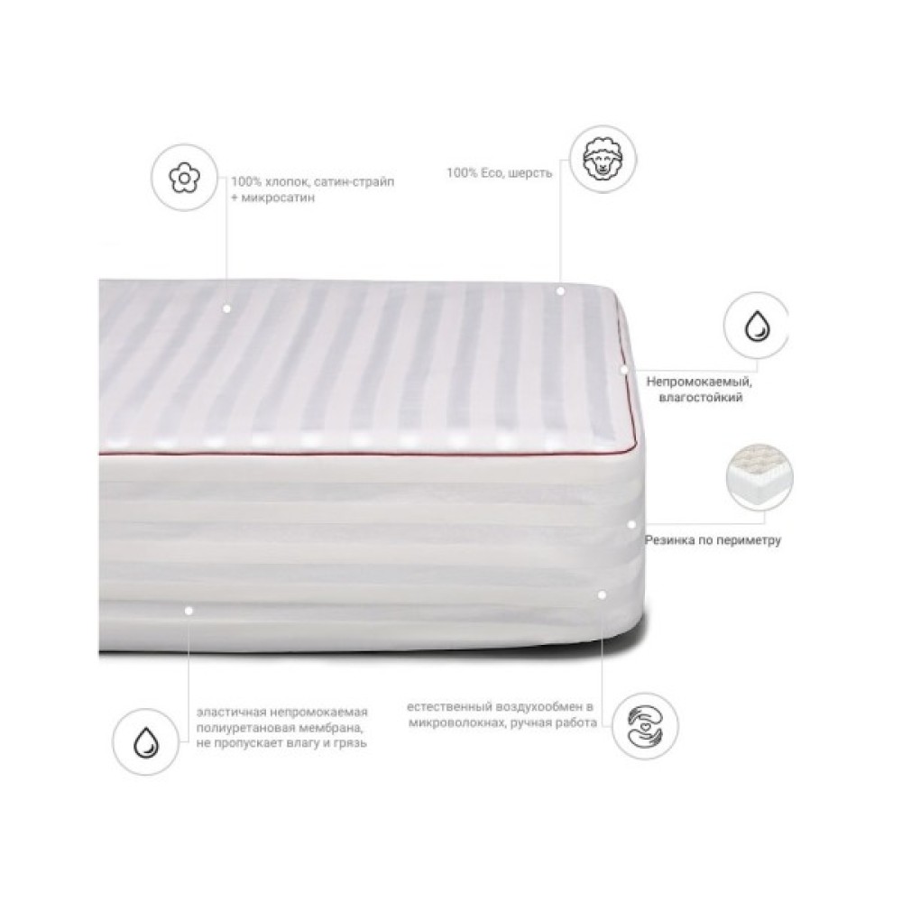 Наматрацник на гумці з високоякісної італійської тканини класу "DeLuxe". Тканина має назву "Сатин-страйп Італія", яка є довговічною, складається виключно зі 100% високоякісного бавовняного волокна. Сатинова тканина чохла має складне жакардове переплетення, що надає наматрацнику не тільки високоестетичної вишуканість, але й збільшує міцність тканини загалом.