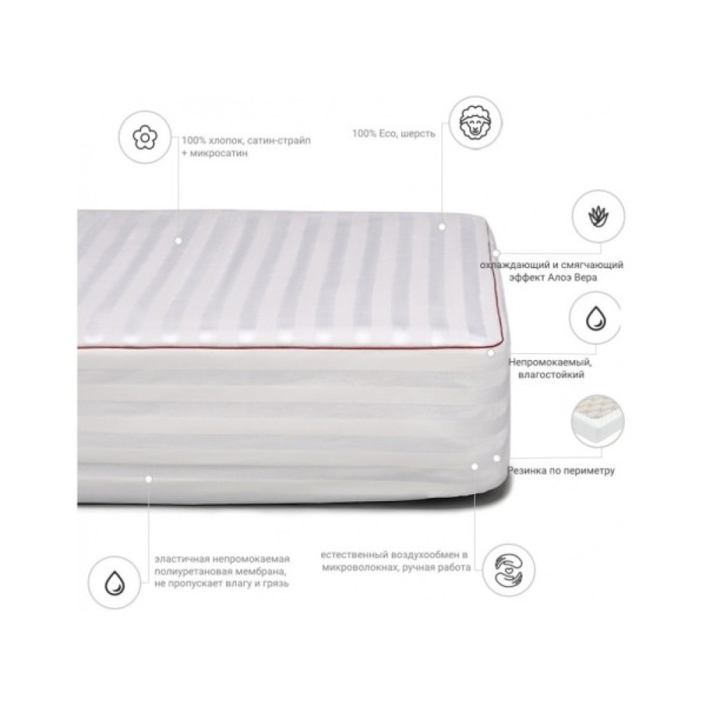 Завдяки просоченню алое вера наматрацник має вентилювальні, антибактеріальні, зм'якшувальні, регенерувальні та заспокійливі властивості, що створить комфортні умови для вашого сну. Просочення алое вера має унікальні властивості, і завдяки своїй чудовій властивості проникати в тканини, насичує їх корисними речовинами в процесі виробництва, а також регулює температуру тіла, що дасть змогу вашій шкірі вільно «дихати».