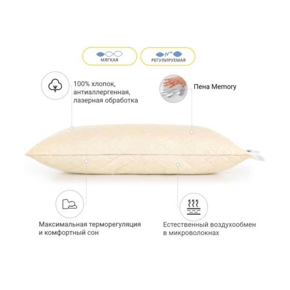 А високотехнологічна лазерна обробка надає бавовняній тканині не тільки естетичний вигляд, але й продовжує термін експлуатації самого виробу. Тканина зі 100% високоякісної єгипетської бавовни, досить щільна та довговічна. Завдяки бавовні дає змогу «дихати» виробу і не порушує природну мікроциркуляцію повітря в подушці, у такий спосіб ви не будете пітніти під час сну навіть дуже спекотного літа.