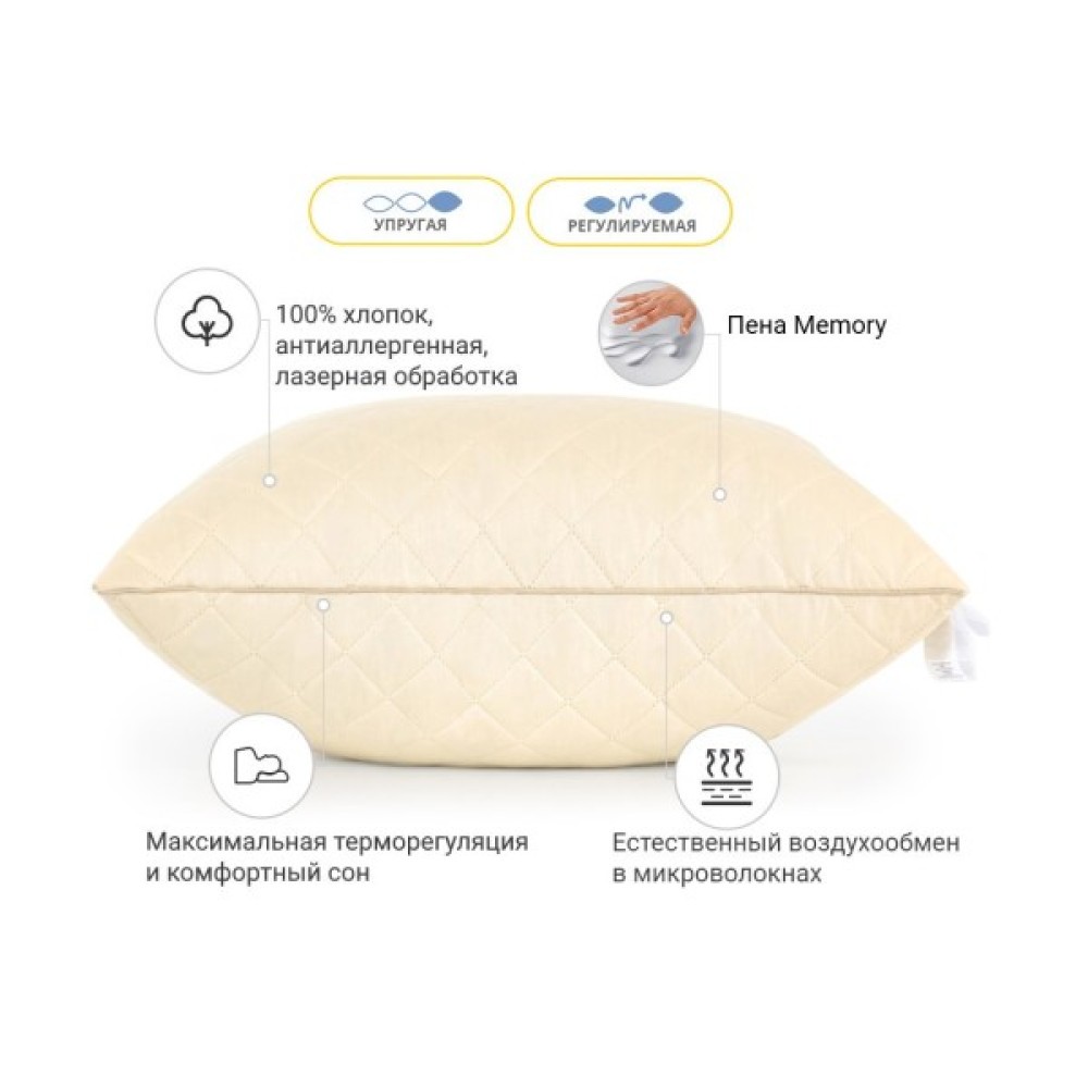 А високотехнологічна лазерна обробка надає бавовняній тканині не тільки естетичний вигляд, але й продовжує термін експлуатації самого виробу. Тканина зі 100% високоякісної єгипетської бавовни, досить щільна та довговічна. Завдяки бавовні дає змогу «дихати» виробу і не порушує природну мікроциркуляцію повітря в подушці, у такий спосіб ви не будете пітніти під час сну навіть дуже спекотного літа.