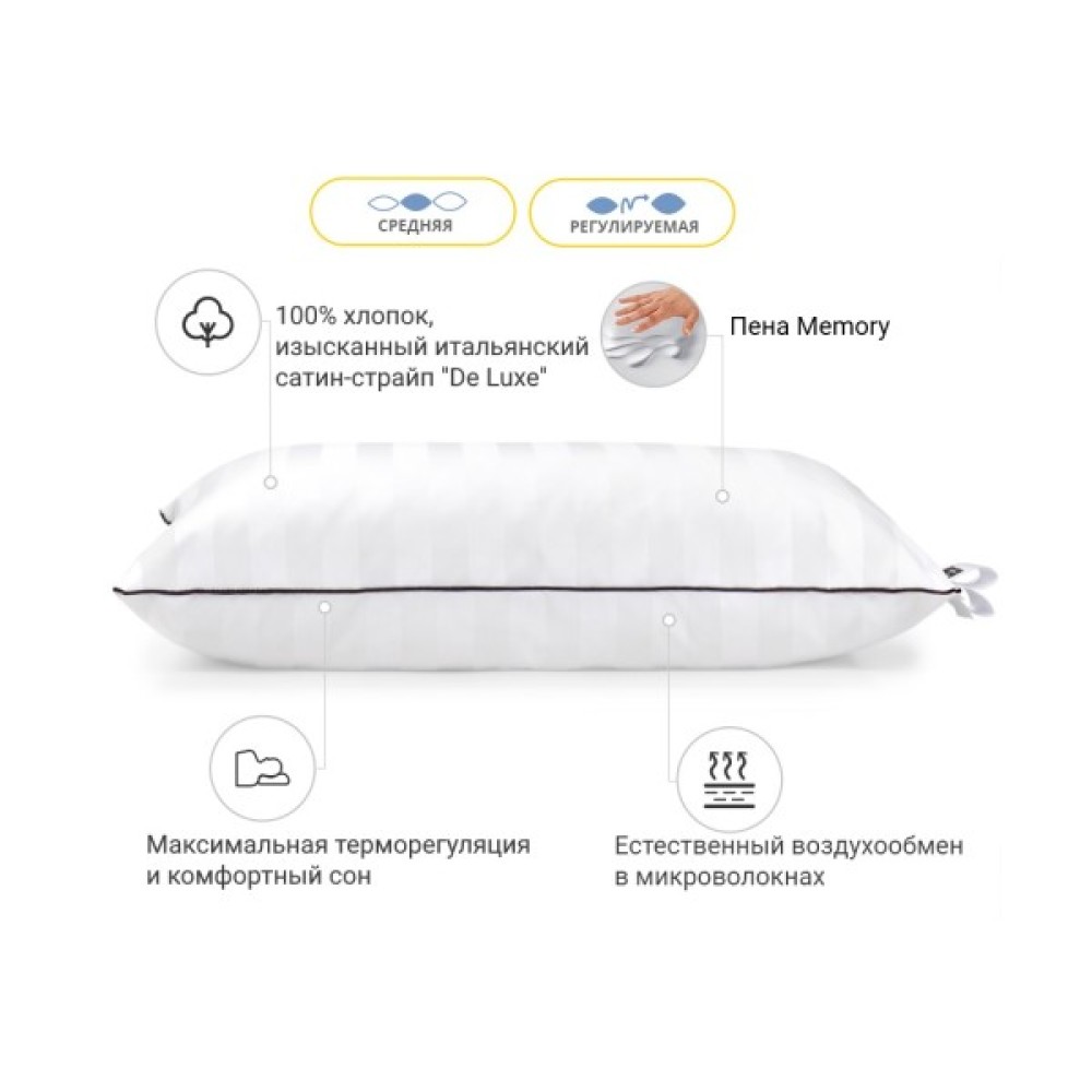 Середня — оптимально розрахована вага наповнювача для досягнення гарних показників з пружності. Ця висота прекрасно підійде людям, які люблять середні, у міру пружні подушки. Подушку можна віднести до розряду стандартних, середніх за м'якістю та висотою. Також не хочеться втратити можливість підкреслити величезний плюс подушок — вони регульовані! Вся принадність у тому, що в подушці є вбудована блискавка (вона розмішена збоку подушки), завдяки якій ви в будь-який момент зможете вийняти трохи наповнювача та підлаштувати подушку повністю під себе.