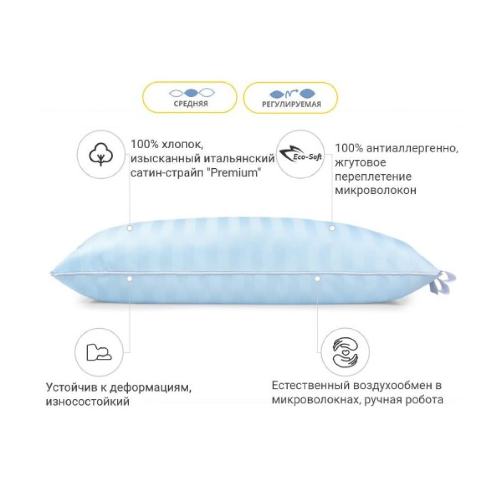 Оптимально розрахована вага наповнювача для досягнення високих показників з пружності. Подушку можна віднести до розряду стандартних, середніх за м'якістю та висотою подушок. Висота подушки 11-14 см. Величезним плюсом є можливість регулювання подушки — збоку міститься змійка, завдяки якій ви будь-якої миті зможете вийняти трохи наповнювача і підлаштувати подушку повністю під себе.