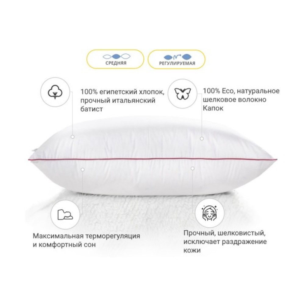 Основною перевагою шовкових подушок є натуральний шовк — єдиний природний матеріал, який не викликає алергічних реакцій, гігроскопічний, стійкий до перепадів температур, тривалий термін експлуатації, гіпоалергенний, антистатичний, легкий, шовковистий, м'який і міцний, має гладку поверхню, що запобігає подразненню шкіри, має дивовижну терморегуляцію й підтримує комфортний мікроклімат у ліжку, не створює парникового ефекту. Подушка Deluxe Hand Made підійде людям, які люблять середні, у міру пружні подушки. Подушку можна віднести до розряду стандартних, середніх за м'якістю та висотою подушок. Висота подушки 11-14 см.