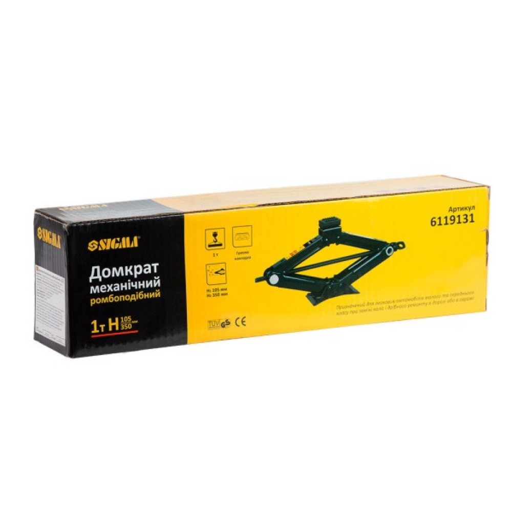 Домкрат механічний ромбовидний 1т Н 105-350мм SIGMA (6119131) призначений для виконання ремонтних робіт при поломці легкових автомобілів, а також для інших робіт з підняття невеликих вантажів. Даний інструмент має ромбовидної конструкцією. Робота гвинтового ромбовидного домкрата дуже проста і полягає в тому, що при обертанні рукоятки відбувається стиснення або разжатие чотирьох важелів, закріплених за допомогою шарнірів. За рахунок цього і відбувається підйом або опускання вантажу.