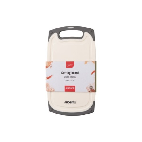 Кухонна дошка з жолобом має прямокутну форму із закругленими кутами. Її виготовлено з пластику білого кольору. Має протиковзкий борт із термостійкої гуми чорного кольору. Для зручності під час користування передбачено отвір, за нього можна повісити аксесуар на гачок. Можна мити в посудомийній машині.