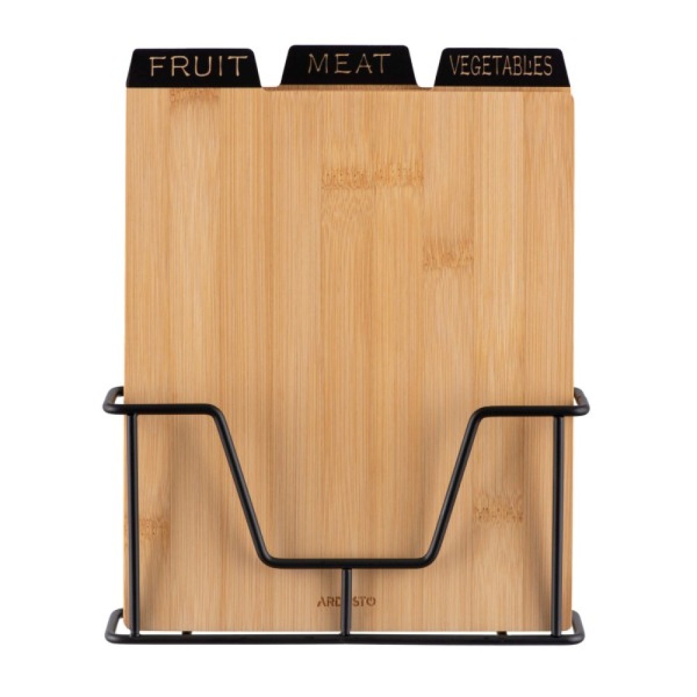 Кухонні дошки ARDESTO серії Midori забезпечать комфорт під час нарізання продуктів і стануть корисним аксесуаром на кухні. Вироби виготовлено з бамбука – екологічного та гігієнічного матеріалу. У наборі три дошки прямокутної форми розміром 23,5 × 7,5 × 27 см – достатньо для створення кулінарних шедеврів. Вироби мають подвійне призначення – їх можна використовувати як для нарізання продуктів, так і для презентації страв. Підставка, яку виготовлено з металу, – це зручне та стильне рішення для організації простору, з нею приладдя завжди буде напохваті. Вироби не рекомендовано мити в посудомийній машині. Цей стильний набір дошок буде вдалим подарунком для близьких і друзів.