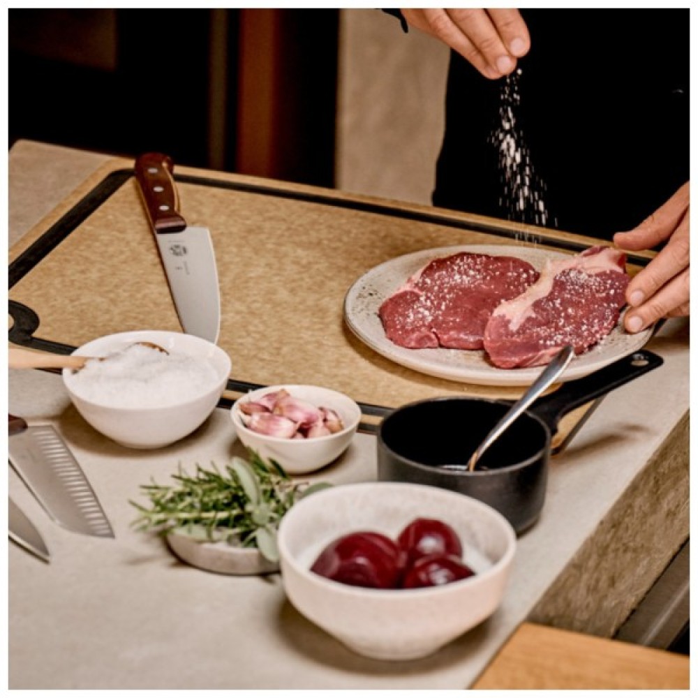 Нарізати, обробляти готову їжу або використовувати для сервірування - потенціал цієї дошки необмежений. А зручна канавка по периметру допоможе зберегти чистоту на робочому столі.