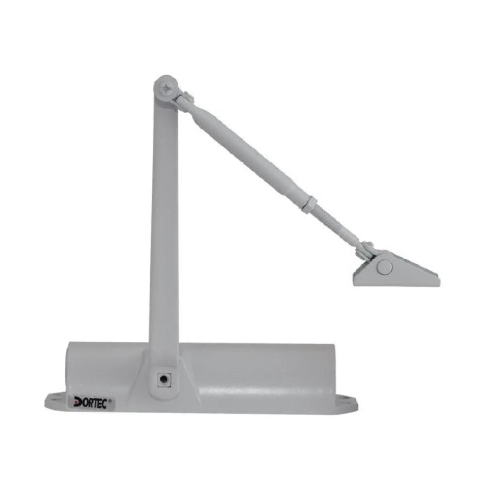 Dortec DT-82 — модель дверного доводчика з колінною конструкцією тяги для універсального типу дверей із верхнім накладним монтажем. Модель обладнана двома регульованими функціями: швидкості зачинення і швидкості дозачинення. Ненав'язливість сірого кольору корпусу дає змогу пристрою гармонійно доповнити дизайн будь-яких дверей. Висока якість конструкції не виробляє жодних зайвих звуків у роботі, відчиняючи й зачиняючи двері плавно і дбайливо, продовжуючи у такий спосіб тривалість експлуатації як самих дверей, так і замків, якими вони обладнані. Модель виготовлена з алюмінію, який пройшов процедуру загартовування, що дає змогу використовувати її в умовах жорсткого клімату.