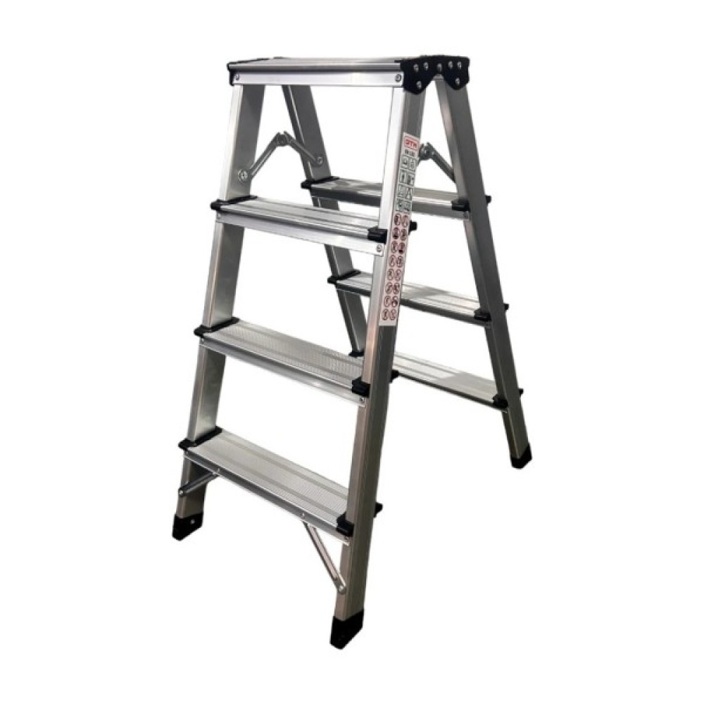GTM KMH1204 - компактна алюмінієва драбина у формі двосторонньої стрем'янки, яка чудово підходить як для побутового, так і для професійного використання. У даній моделі драбини 4 сходинки і максимальна висота до верхньої сходинки 78 см.