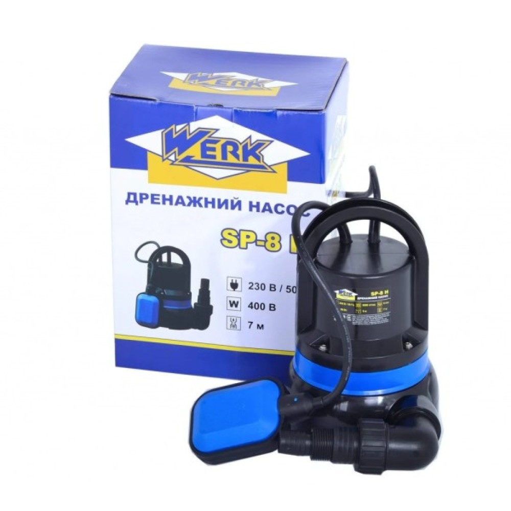 Заглибний насос для чистої води Werk SP-8H призначений для перекачування дощової, відкачування ґрунтових вод з дрібними частками до 5 мм, наповнення, осушення басейнів, водойм, для поливу в садівництві.