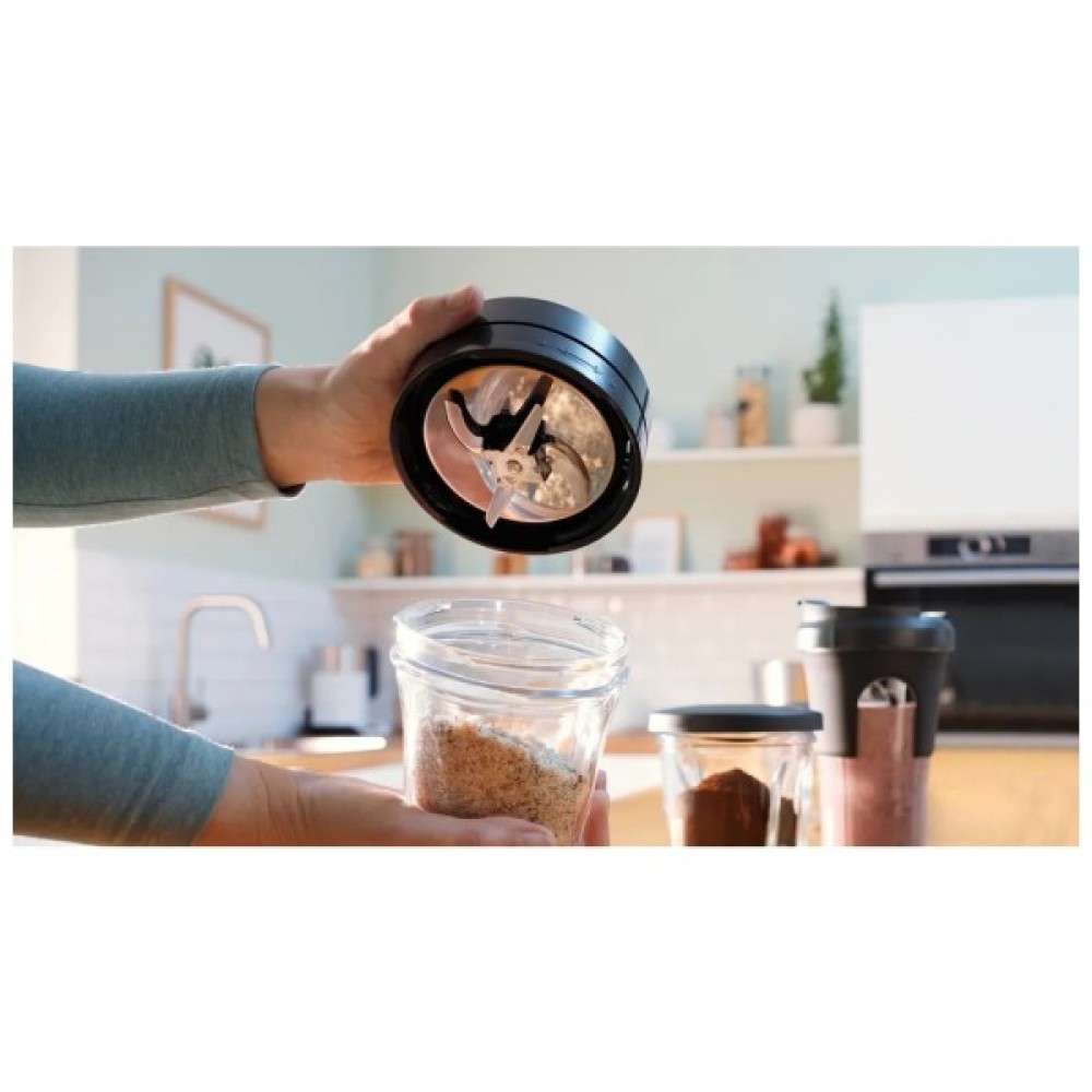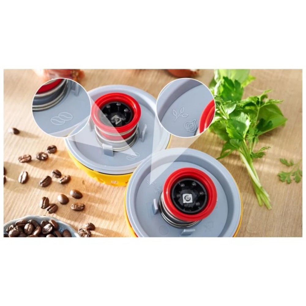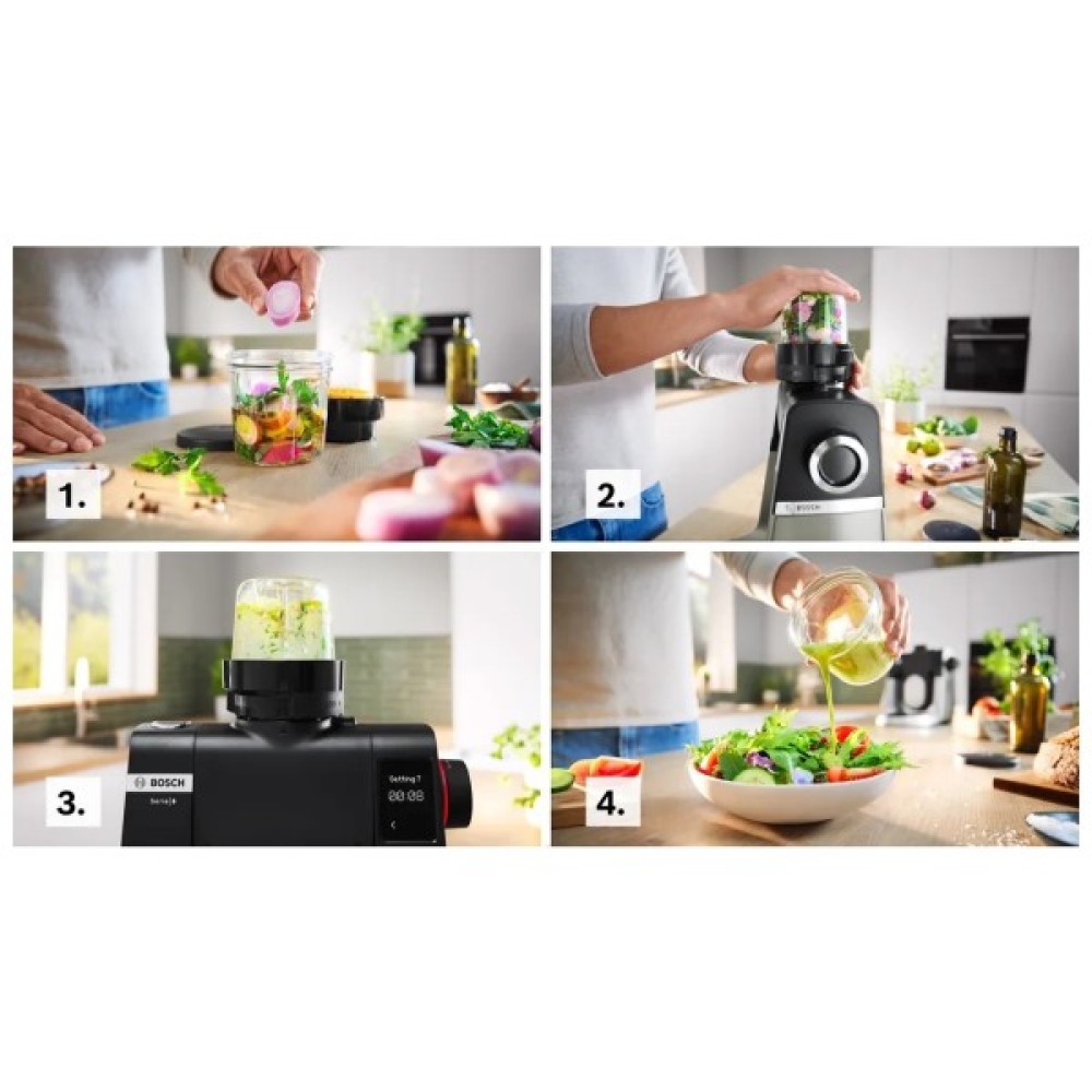 Набір Bosch TastyMoments MUZS68TM — це універсальне рішення 5-в-1, яке поєднує функції блендера, млинка, подрібнювача, контейнера для зберігання та контейнера ToGo для зручного транспортування. Завдяки міцним лезам із нержавіючої сталі набір легко справляється навіть із твердими інгредієнтами — кавовими зернами, сиром, горіхами чи льодом. Це дозволяє швидко готувати свіжі смузі, соуси, подрібнювати спеції або робити заготовки для страв.