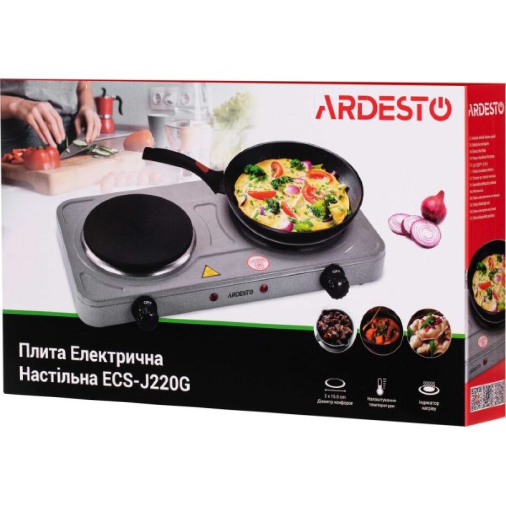 Електрична плита ECS-J220G темно-сірого кольору з двома конфорками діаметром 15,5 см й індикатором нагріву. Потужність кожної конфорки – 1 000 Вт. Чудово підійде для приготування різноманітних страв вдома, на дачі, в гуртожитку, в умовах кемпінгу тощо. Є захист від перепадів напруги в електромережі й регулятор температури має п’ять положень нагріву. Загальна потужність становить 2 000 Вт, напруга – 220 – 240 В. Корпус виготовлено із емальованої сталі. Легка в налаштуванні, користуванні й догляді.