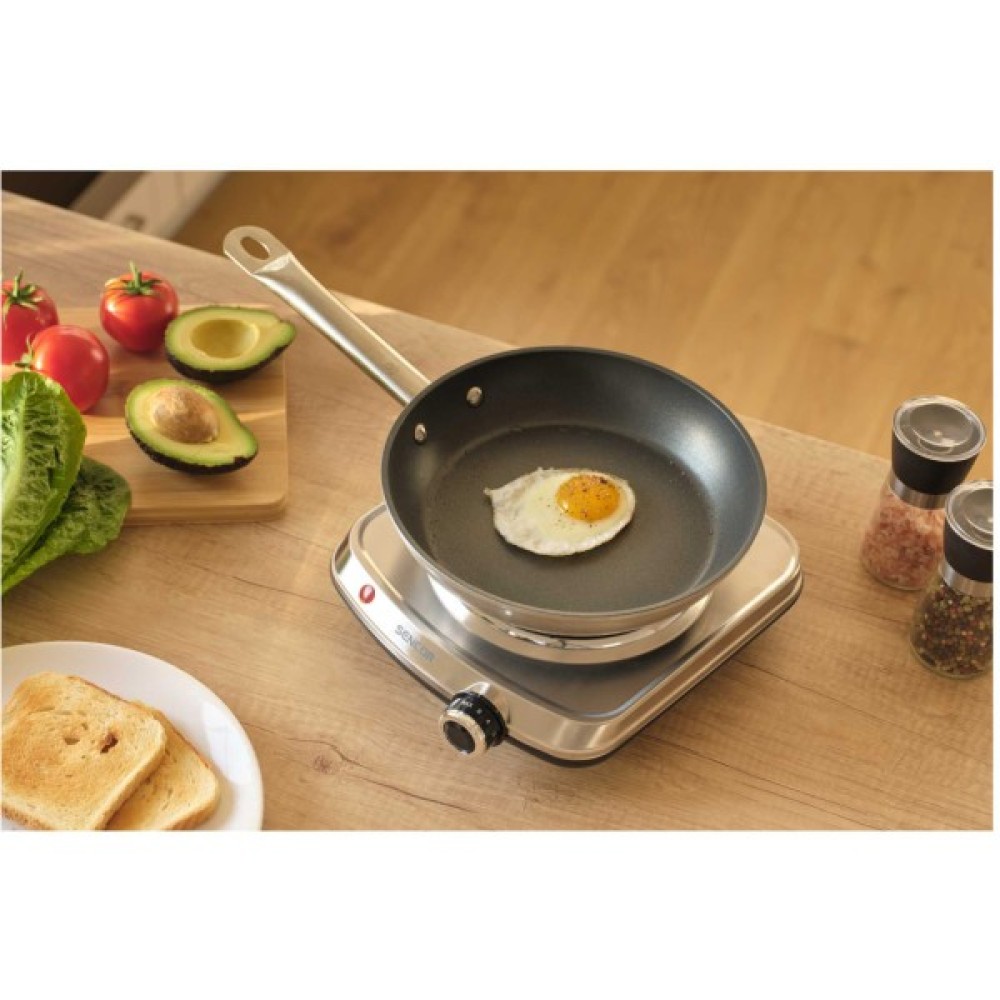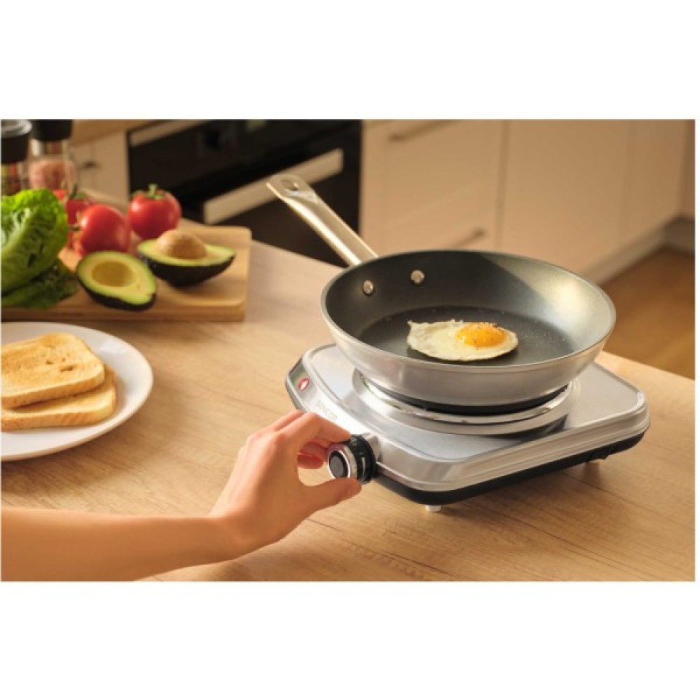 Електроплита має компактний дизайн і легку вагу, що робить її зручною для транспортування. Для безпеки користувача передбачено захист від перегріву, світловий індикатор роботи та протиковзкі ніжки, які забезпечують стійкість на будь-якій поверхні. Перемикач ON/OFF дозволяє легко вмикати та вимикати пристрій, а споживана потужність 1500 Вт гарантує швидке нагрівання. Sencor SCP1506SS — це надійна, проста в користуванні та практична електроплита для будь-якої кухні.