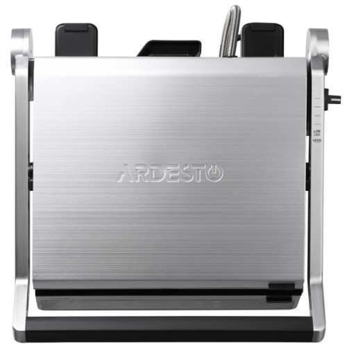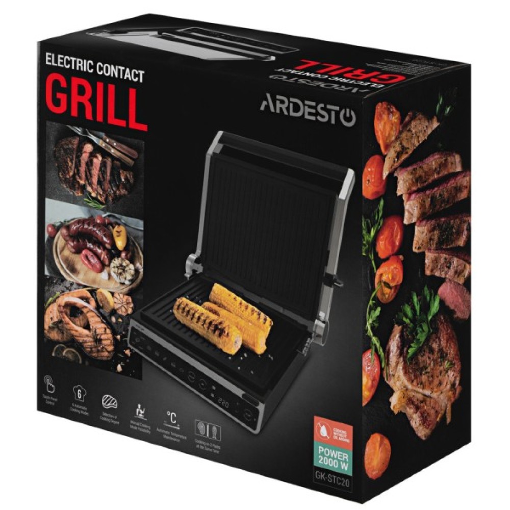 Електрогриль з потужністю 2000 Вт, сенсорним керуванням, шістьма автоматичними режимами приготування, регулюванням температури та ступеня готовності, а також автоматичним визначенням товщини продукту. Повне відкриття конструкції дозволяє використовувати обидві поверхні одночасно, з окремою установкою температури для кожної пластини. Знімні пластини з антипригарним покриттям та лоток для збору жиру забезпечують зручне та просте очищення.