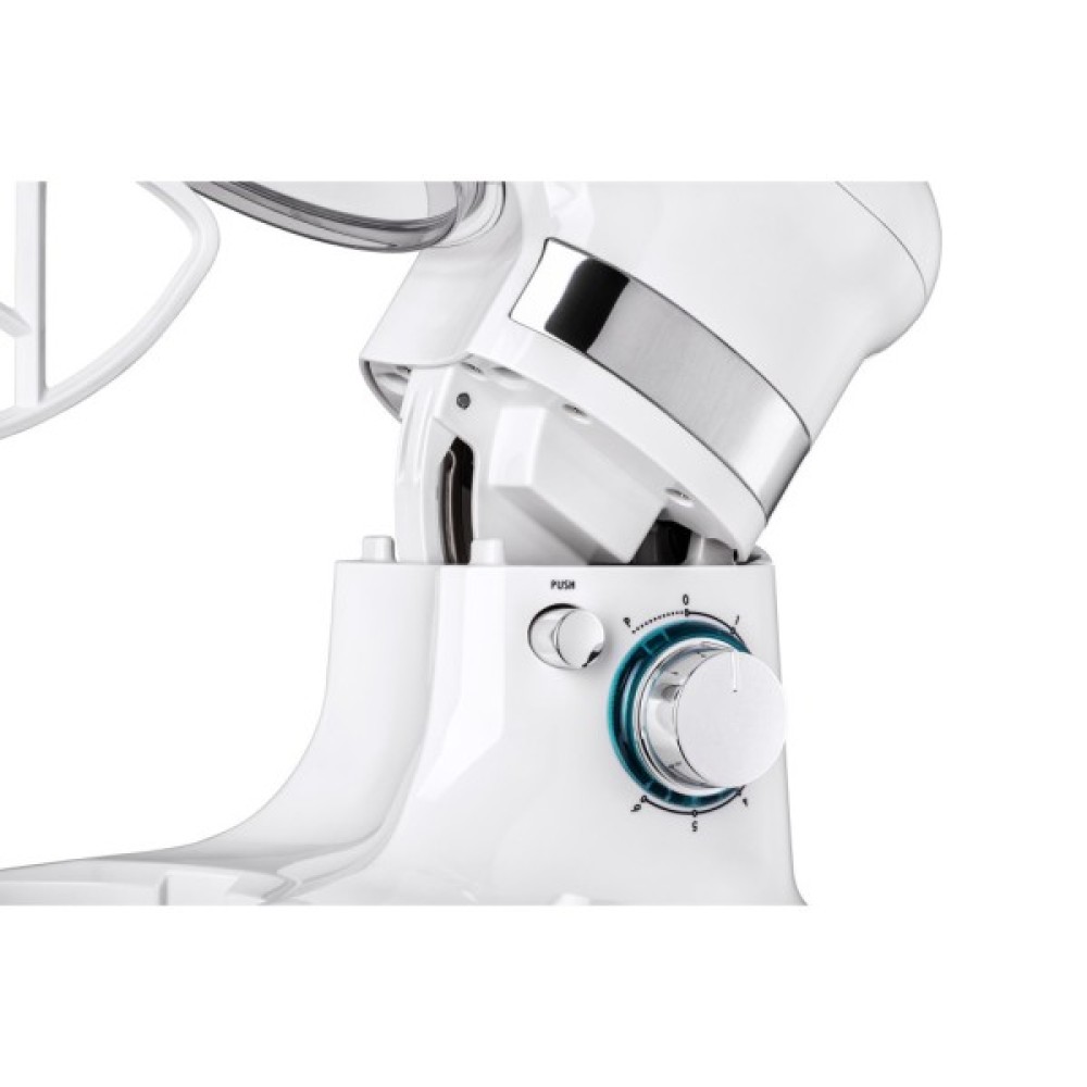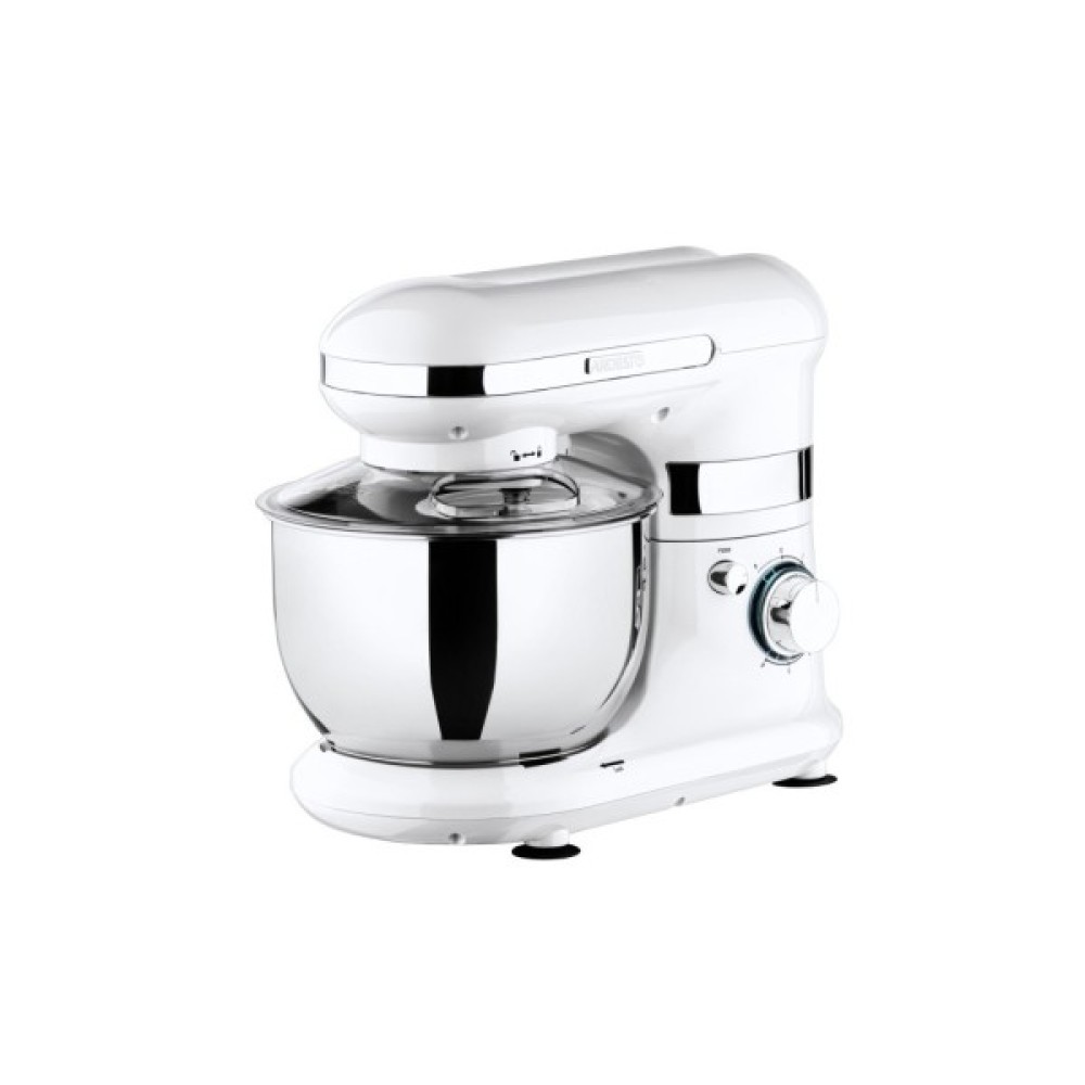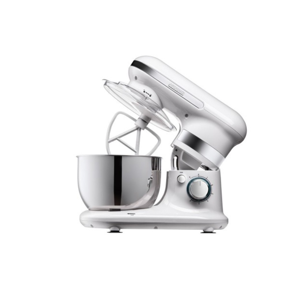 Міксер виконано у ергономічному корпусі з міцного пластику та доповнено хромованими елементами. Чаша на чотири літри вироблена з нержавіючої сталі, а насадки – як з пластику, так і з металу. Вінчик та А-подібна насадка призначені для збивання крему та інших інгредієнтів з рідкою консистенцією, а гачок для замісу тіста. Прозора знімна кришка захищає від бризок, а для вилучення насадок є спеціальна клавіша. Двигун з потужністю 800 Вт захищено від перегріву, передбачено шість режимів швидкості, а також режим Pulse. Для керування використовується зручний важіль, а для стійкого встановлення є ніжки-присоски.