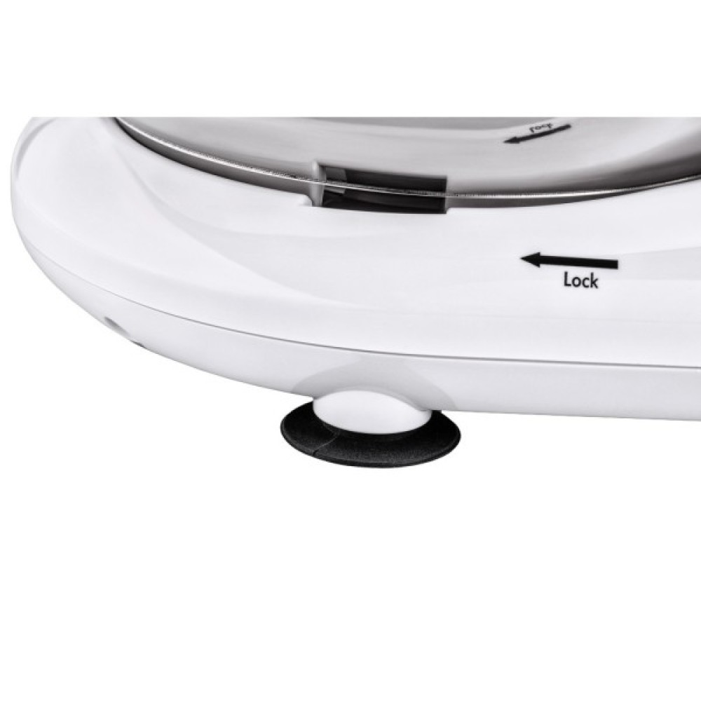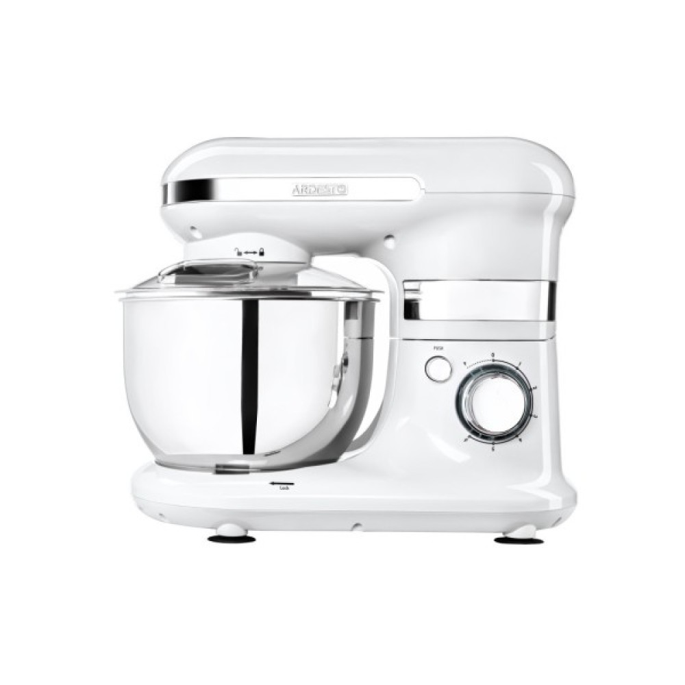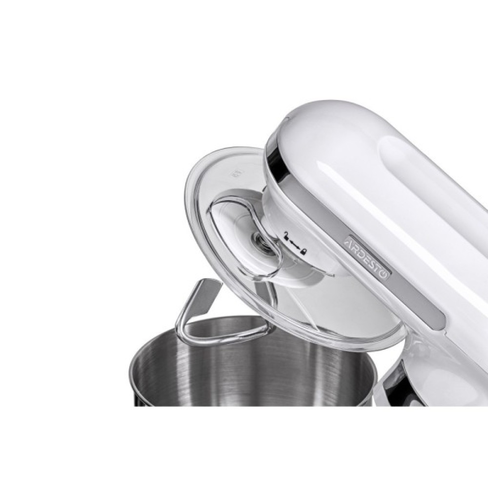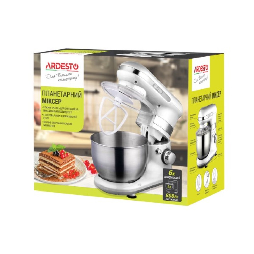 Міксер виконано у ергономічному корпусі з міцного пластику та доповнено хромованими елементами. Чаша на чотири літри вироблена з нержавіючої сталі, а насадки – як з пластику, так і з металу. Вінчик та А-подібна насадка призначені для збивання крему та інших інгредієнтів з рідкою консистенцією, а гачок для замісу тіста. Прозора знімна кришка захищає від бризок, а для вилучення насадок є спеціальна клавіша. Двигун з потужністю 800 Вт захищено від перегріву, передбачено шість режимів швидкості, а також режим Pulse. Для керування використовується зручний важіль, а для стійкого встановлення є ніжки-присоски.