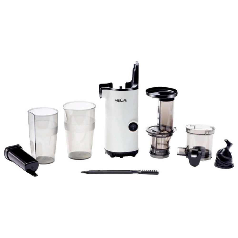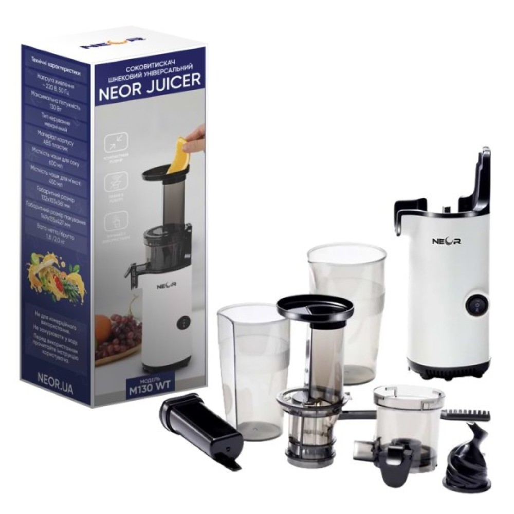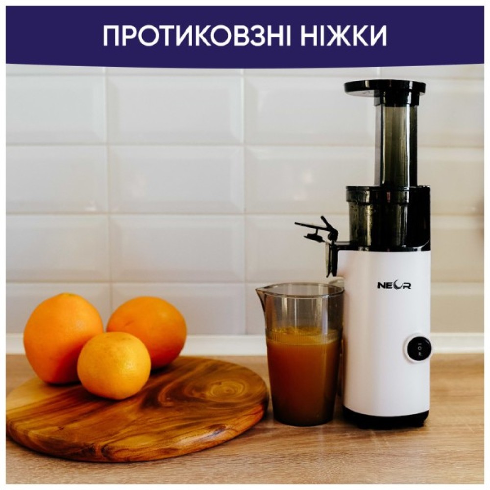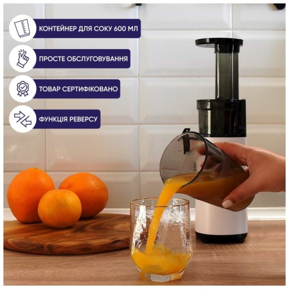 Цей соковитискач стане улюбленцем на кухні. Тиха робота, невеликі габарити, білий стильний корпус. Знизу розташовані гумові ніжки для зручної роботи із пристроєм.