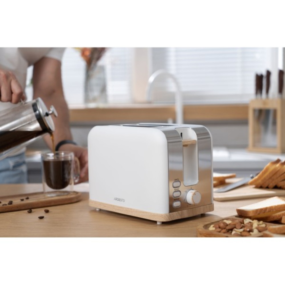 Тостер Ardesto потужністю 800–930 Вт надає змогу приготувати два тости одночасно. Широкі слоти з автоматичним центруванням гарантують рівномірне обсмажування скибок будь-якої товщини. До того ж передбачено регулювання ступеню смаження (7 рівнів). Функції підігрівання і розморожування додають зручності, адже можна швидко розморозити та підігріти смаколики прямо з морозильної камери.