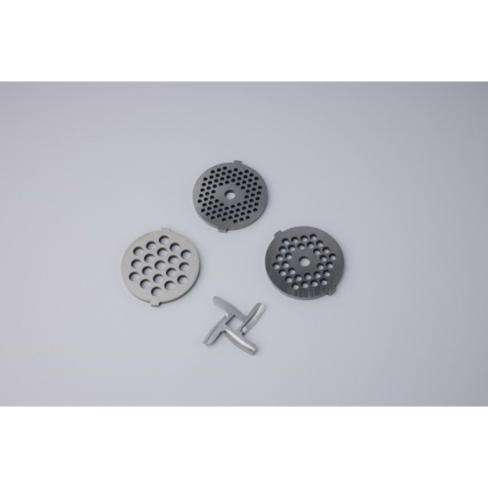 Диск з діаметром отворів 3 мм і 5 мм допоможе приготувати дрібний фарш, а для більш крупного помелу передбачена модель з 7 мм перфорацією.
