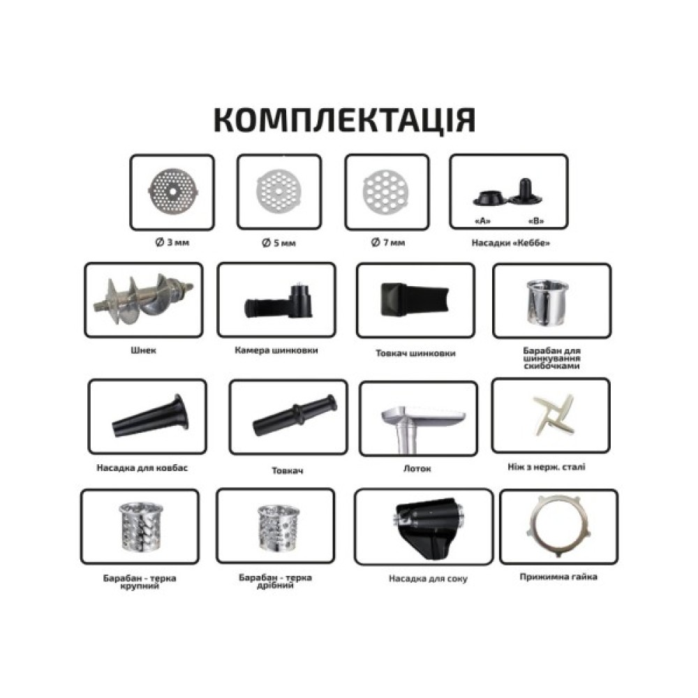 У комплекті: 3 грати з різним діаметром, для отримання фаршу різної густини.