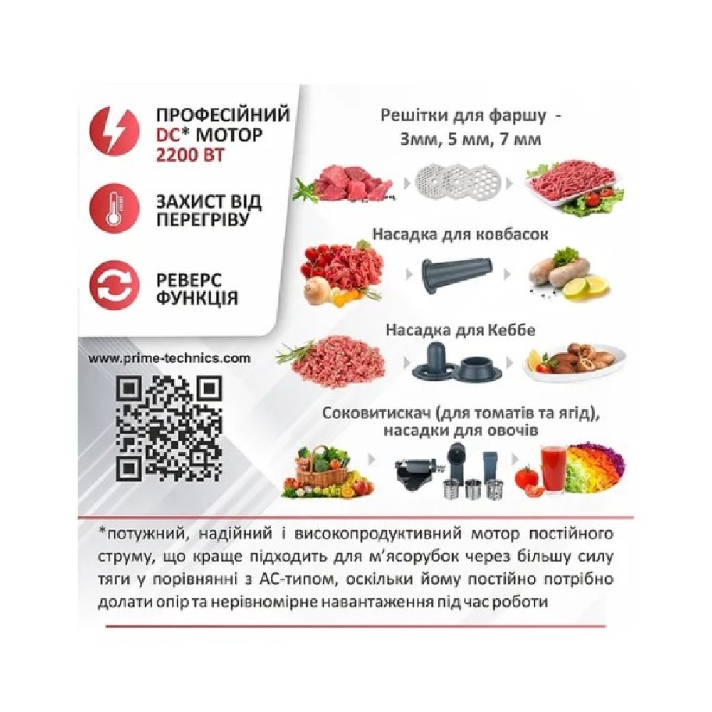 На приладі встановлений DC-мотор - потужний, надійний і високопродуктивний мотор постійного струму, що краще підходить для мʼясорубок через більшу силу тяги у порівнянні з АС-типом, оскільки йому постійно потрібно долати опір та нерівномірне навантаження під час роботи.