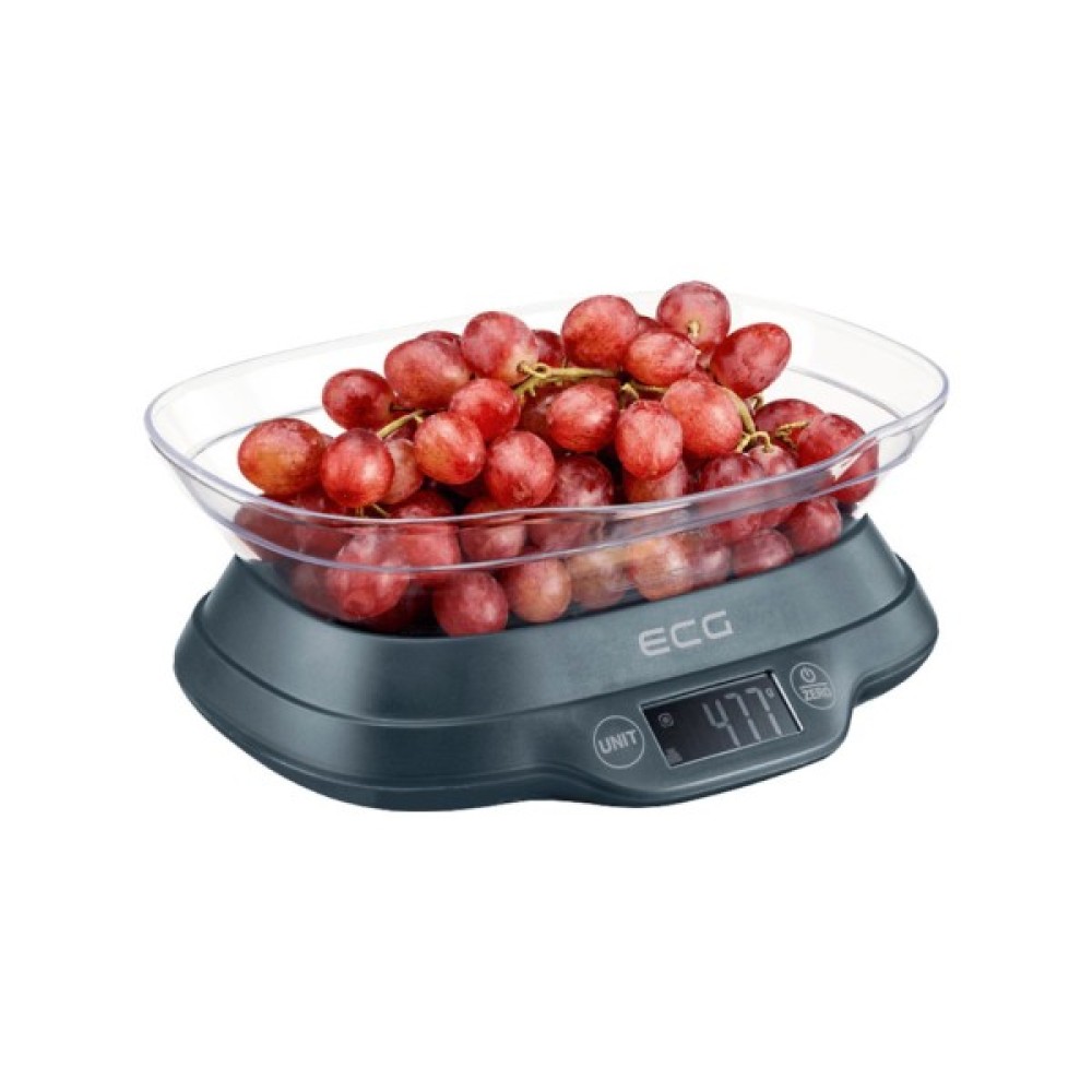 Ваги кухонні ECG SM KV 1120 з максимальним навантаженням на 5 кг і кроком вимірювання 1 грам, обладнані знімною пластиковою чашею.