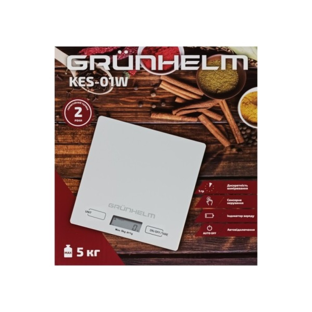 Ваги кухонні KES-01W GRUNHELM - виготовлені з міцного матеріалу - загартованого скла, що робить їх дуже надійними та довговічними. Це дозволяє використовувати їх щодня без ризику пошкодження. Крім того, вони легко очищуються і не займають багато місця на кухонному столі або в шафці. Такі кухонні ваги є необхідними для будь-якої господині або кухаря, які прагнуть до точності та зручності у процесі приготування їжі. Оснащені індикатором навантаження, а також індикатором низького заряду батареї. Максимальна вага - 5 кг.