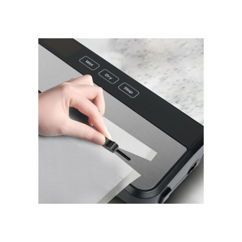 Вакуумний пакувальник з міцним пластиковим корпусом та фіксуючими кнопками з боків. Оснащений 4 режимами вакуумування: ручний режим, режим для сипучих продуктів, для вологих та для сухих продуктів. Має електронну панель керування з підсвіткою робочих кнопок і LED-екраном, який відображає таймінг вакуумування та запаювання, що забезпечує зручність і наочність у використанні. Вбудований ніж на панелі керування дозволяє швидко та акуратно відрізати плівку для вакуумування. Максимальна ширина запаювання — 30 см. У комплекті — 10 пакетів розміром 30 × 20 см.