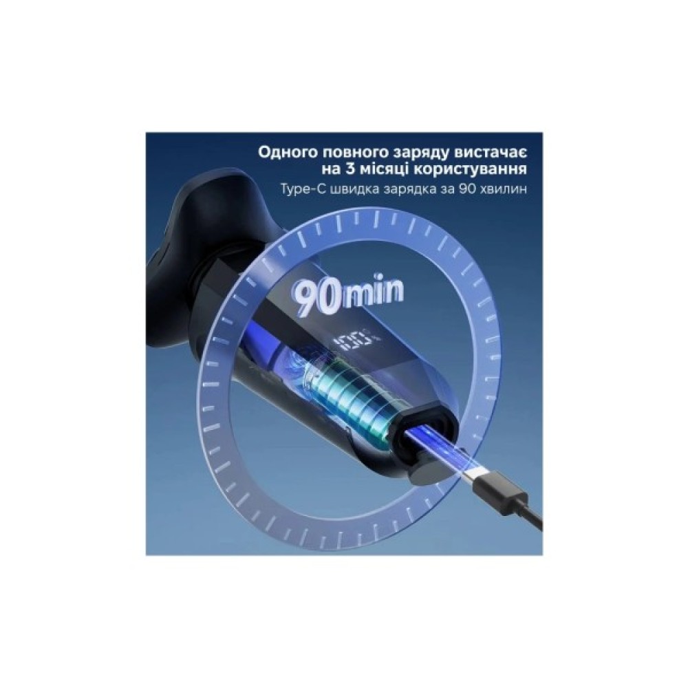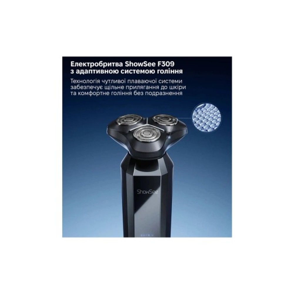 Електробритва ShowSee F309 — надійний пристрій для щоденного догляду за собою. Оснащена трьома плаваючими роторними головками, вона точно повторює контури обличчя, забезпечуючи гладке гоління без подразнень. LED-дисплей дозволяє в реальному часі контролювати заряд акумулятора, стан леза та нагадування про очищення.