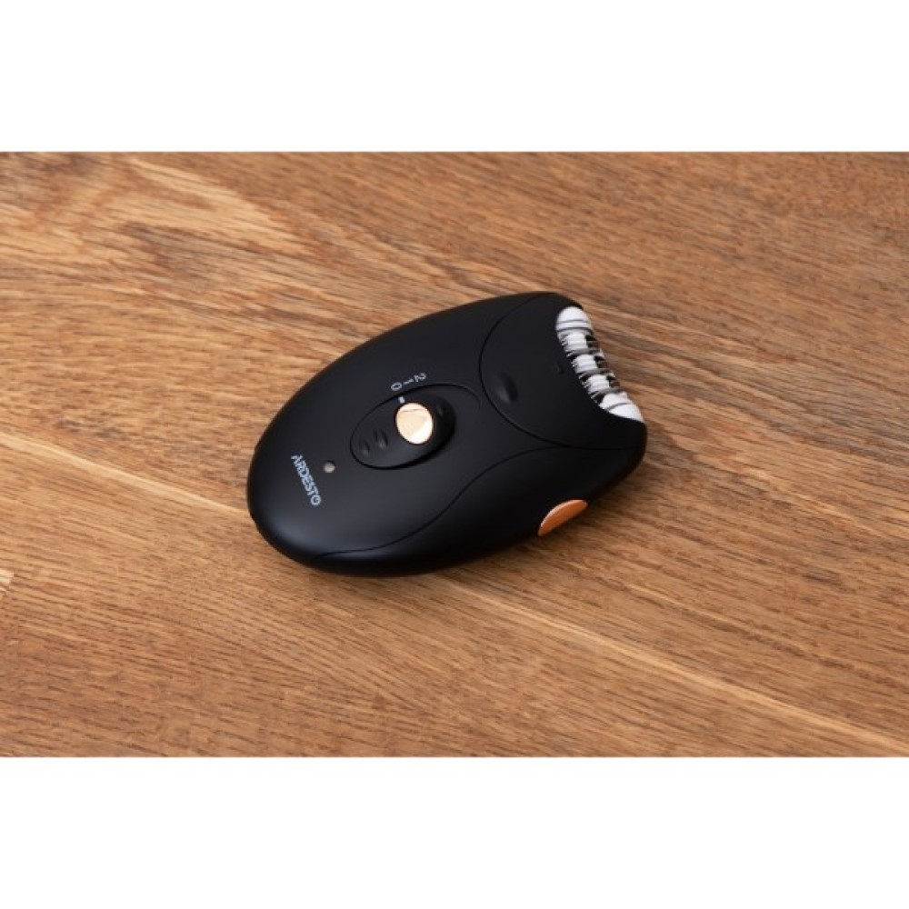 Корпус епілятора виготовлений із практичного пластику, а знімна головка захищена додатковою кришкою. Вбудований акумулятор забезпечує автономну роботу впродовж 40 хвилин. Для повного заряджання знадобиться не більш ніж 80 хвилин, а для зручності є індикатор.