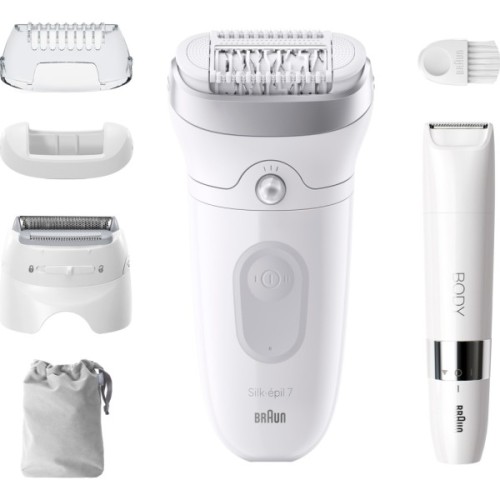 • Braun Silk-epil 7 включає в себе кілька спеціалізованих насадок, розроблених для догляду за різними зонами тіла. Насадка для обличчя призначена для особливо делікатної роботи на чутливих областях, забезпечуючи дбайливе видалення волосся без подразнення шкіри. Для більш важкодоступних і чутливих зон, таких як бікіні та пахви, передбачені насадки, які забезпечують високу точність та комфорт під час епіляції, мінімізуючи болючі відчуття та подразнення.