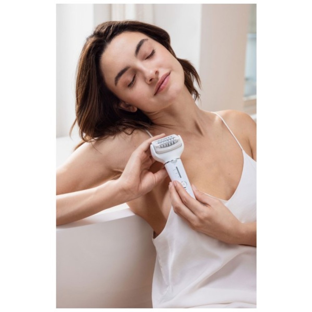 Дизайн епілятора поєднує в собі зручну ручку та гнучку на 90° головку, що дозволяє набагато швидше видаляти волосся на тілі – навіть у зоні бікіні та пахв. Завдяки оснащенню всіма насадками, які вам коли-небудь знадобляться, епілятор забезпечує комплексний догляд за тілом.