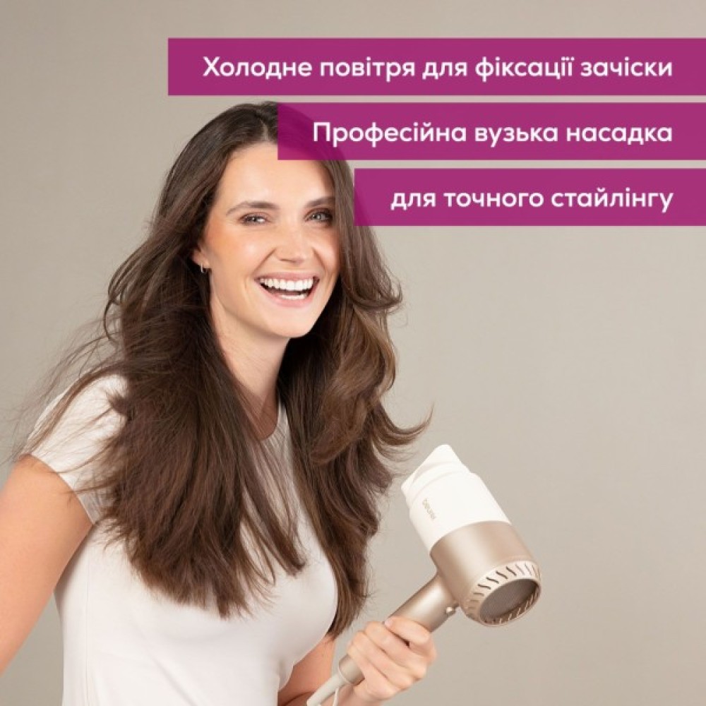Beurer HC 40 має три зручних швидкості та три температурні режими, що дозволяє налаштувати процес укладання відповідно до ваших особистих потреб. Використовуйте режим подачі холодного повітря для закріплення зачіски, щоб вона залишалася бездоганною впродовж усього дня. Спеціальна вузька насадка-концентратор дозволяє точно направити потік повітря на окремі пасма, що особливо зручно для створення об'єму та формування чітких ліній укладки.