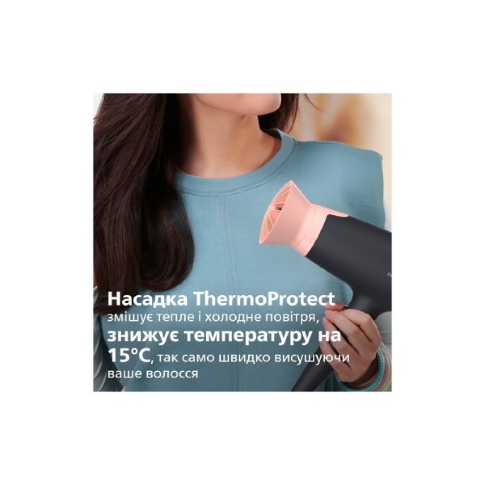 Однією з ключових особливостей цього фена є унікальна насадка ThermoProtect. Ця насадка змішує тепле і холодне повітря, забезпечуючи таким чином дбайливе сушіння. Інноваційна конструкція дозволяє запобігати перегріванню волосся та мінімізувати потенційне пошкодження. Разом із феном також постачається насадка-концентратор шириною 14 міліметрів, яка формує чіткий напрямок повітряного потоку, ідеально підходячи для надання завершальних штрихів вашій зачісці.