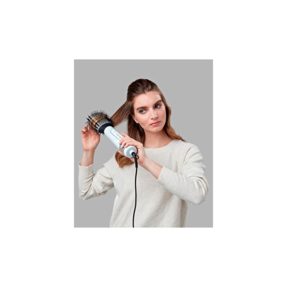 Овальна насадка разом з комбінованою щетиною допомагають підняти волосся від коренів, створюючи неймовірний об'єм. Біла кольорова гама додає стилю і елегантності цьому фену, а довжина шнура в 1.8 м забезпечує комфорт у використанні, дозволяючи розташовувати прилад так, як вам зручно.