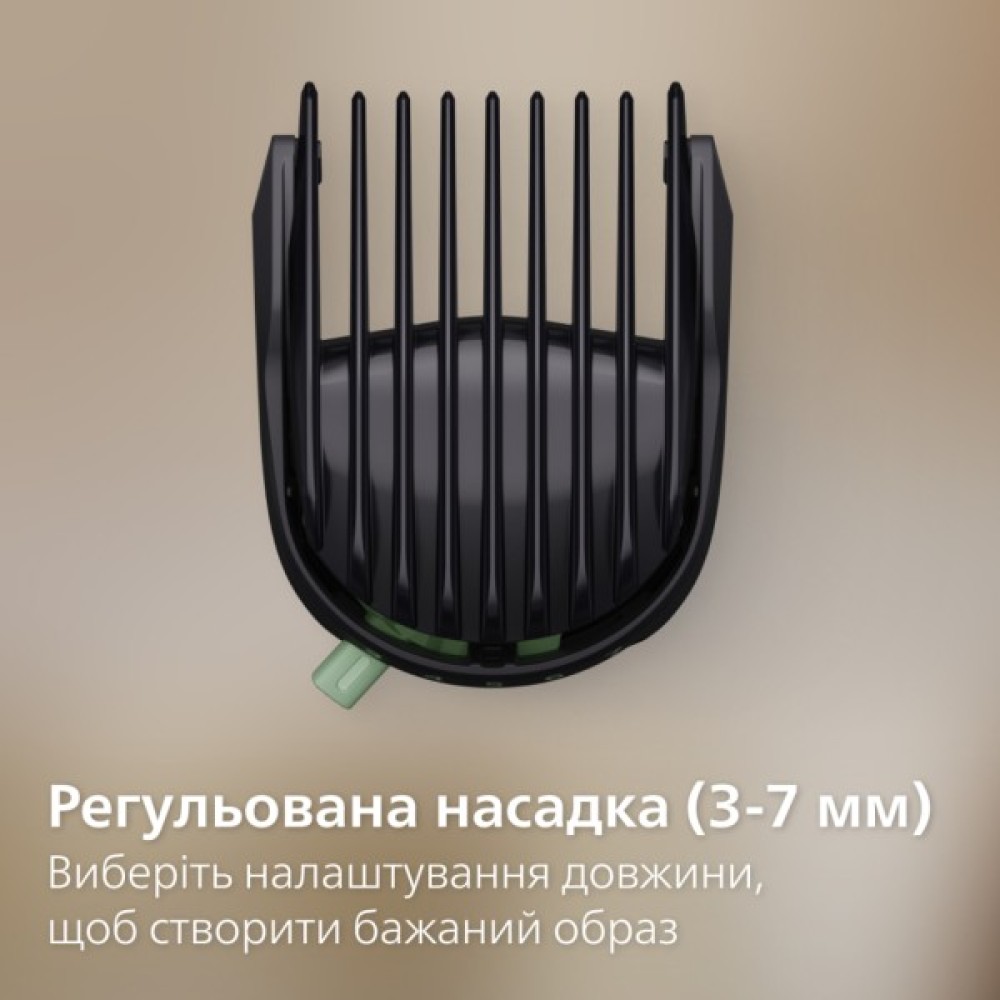 Philips MG5921/15 — це All‑in‑One тример серії 5000 із 10 інструментами, який дозволяє легко підстригти бороду, волосся, тіло, а також акуратно обробити контури, ніс та вуха, використовуючи металеві та точні насадки. Машинка оснащена технологією BeardSense, яка аналізує густину волосся до 125 разів на секунду й автоматично підсилює потужність у щільних ділянках, забезпечуючи при цьому рівномірне та ефективне підстригання. Налаштування довжини здійснюється за допомогою мульти‑гребінця з 11 позиціями — від 0,5 до 16 мм із кроком 1 мм — що дозволяє точно сформувати бажану довжину або стиль.