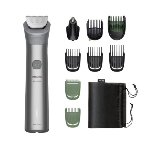 Philips MG5931/15 — універсальний All‑in‑One тример серії 5000 із 10‑ма функціями, розрахований на акуратне оформлення бороди, волосся, тіла та делікатних зон за допомогою різних насадок, серед яких металевий тример і тример для носа та вух.