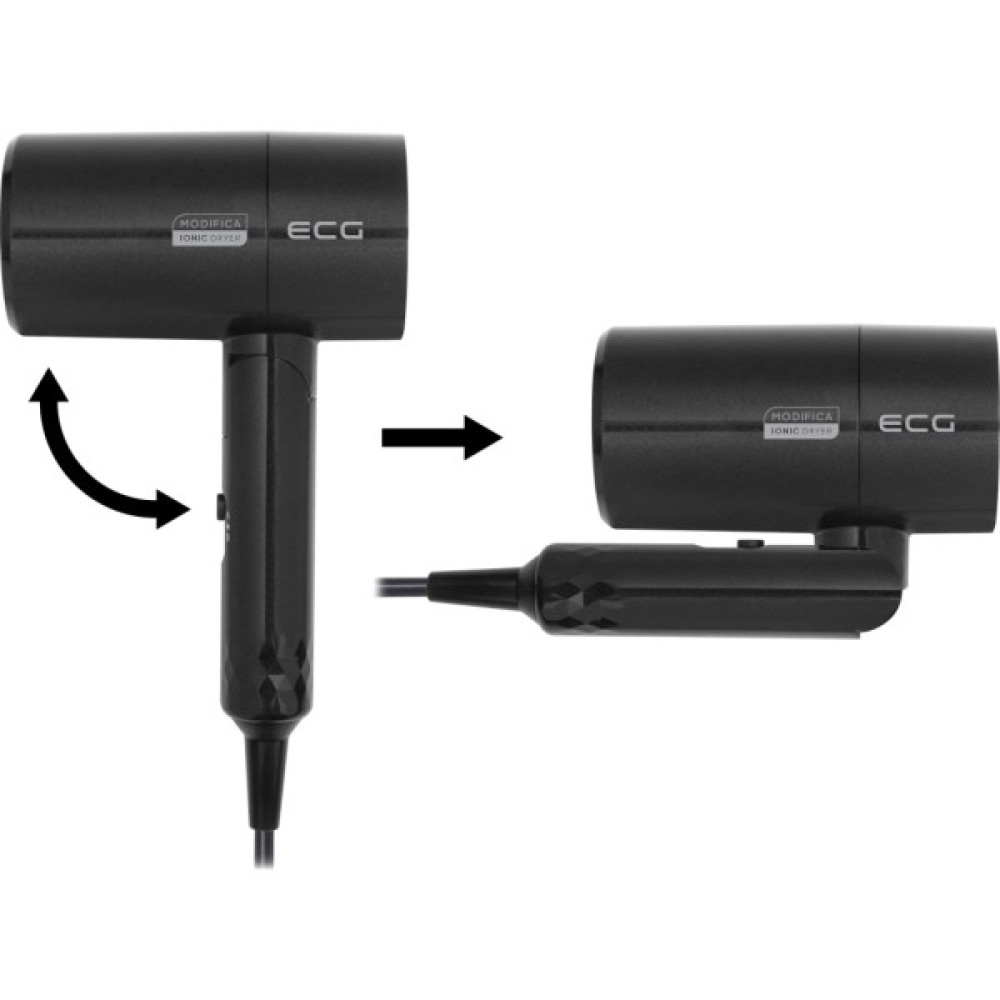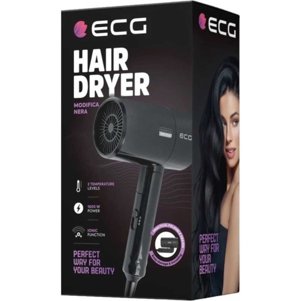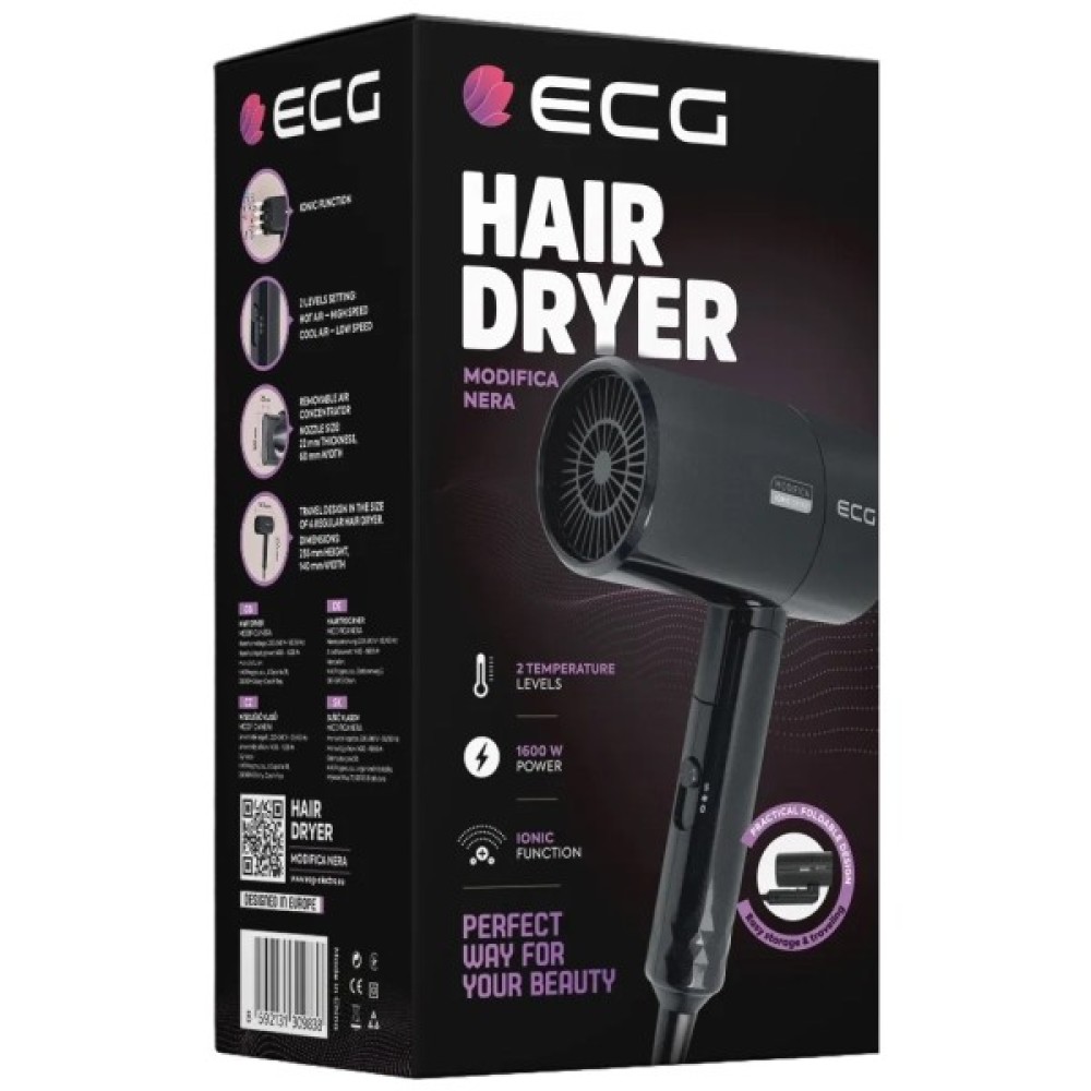 Цей дорожній фен відзначається своєю легкістю — всього 0.5 кг, що спрощує перенесення та зберігання. Складана ручка є ще однією зручністю, яка робить ECG Modifica Nera ідеальним супутником у будь-якій поїздці, займаючи мінімум місця у валізі. Потужність у 1600 Вт гарантує швидке і ефективне сушіння, при цьому не перевантажуючи енерговитрати.