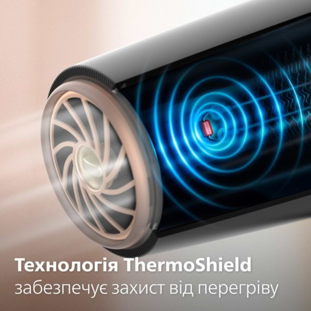 Ультраефективний двигун постійного струму (DC Motor) створює потужний потік повітря, що дозволяє висушити волосся не лише швидко, але й без шкоди для нього. Функція ThermoShield постійно контролює температуру, мінімізуючи ризик перегріву та забезпечуючи ніжний догляд. Додатково, керамічна іонна решітка гарантує 8x іонізацію, що робить ваше волосся м'яким, блискучим і захищеним від статичної електрики.