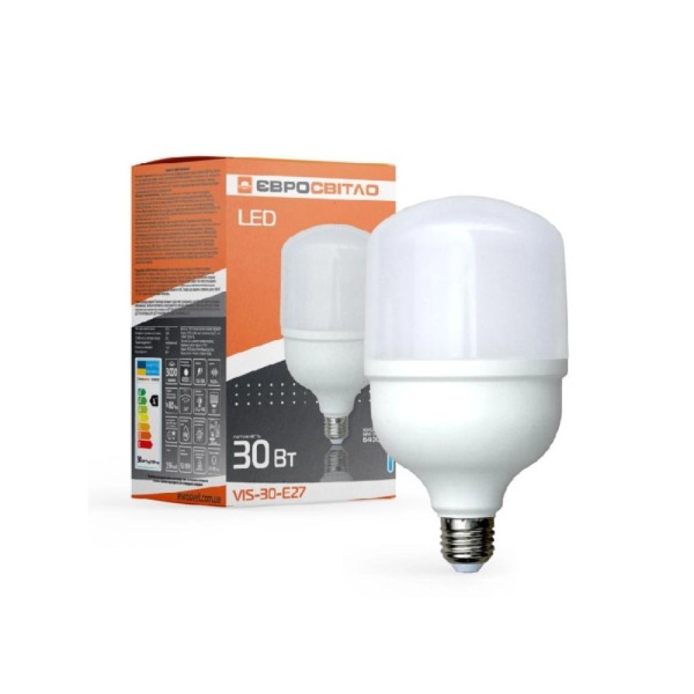 Лампа світлодіодна високопотужна Євросвітло 30Вт 4200К (VIS-30-E27) підходить для місць, де важливо яскраве освітлення, що не спотворює колір.