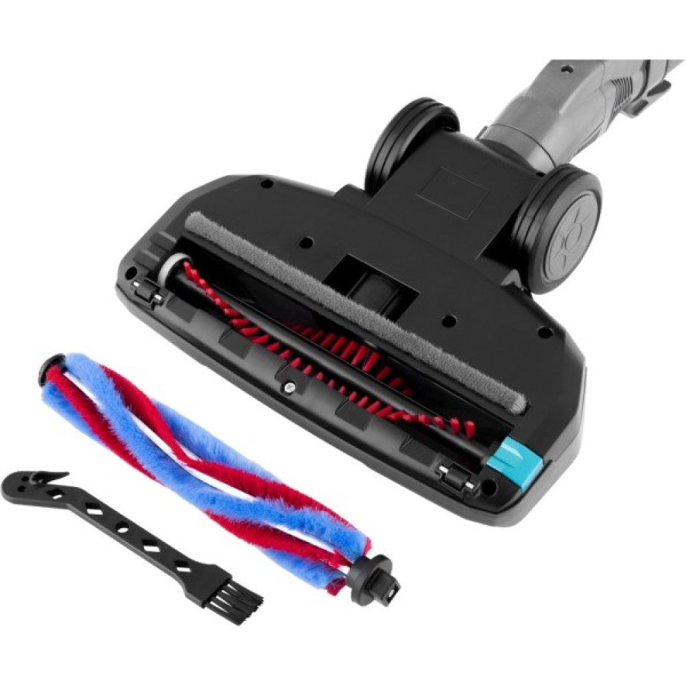 Серед аксесуарів ви знайдете основну насадку з двома змінними щітками - жорсткою щетиною для килимів і гладкою для твердих підлог, комбіновану насадку 2 в 1 для щілин і пилу, маленьку механічну турбощітку для шерсті тварин, щіточку для чищення, а також зручний настінний тримач для компактного зберігання.
