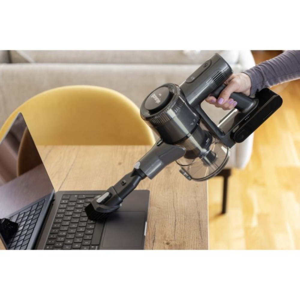 Комплектація включає турбо-щітку, щілинну насадку, насадку для пилу 2-в-1, настінний кронштейн та зарядний пристрій. Це робить пилосос GORENJE SVC222480AA універсальним рішенням для прибирання як підлоги, так і важкодоступних місць.
