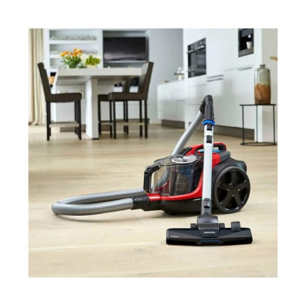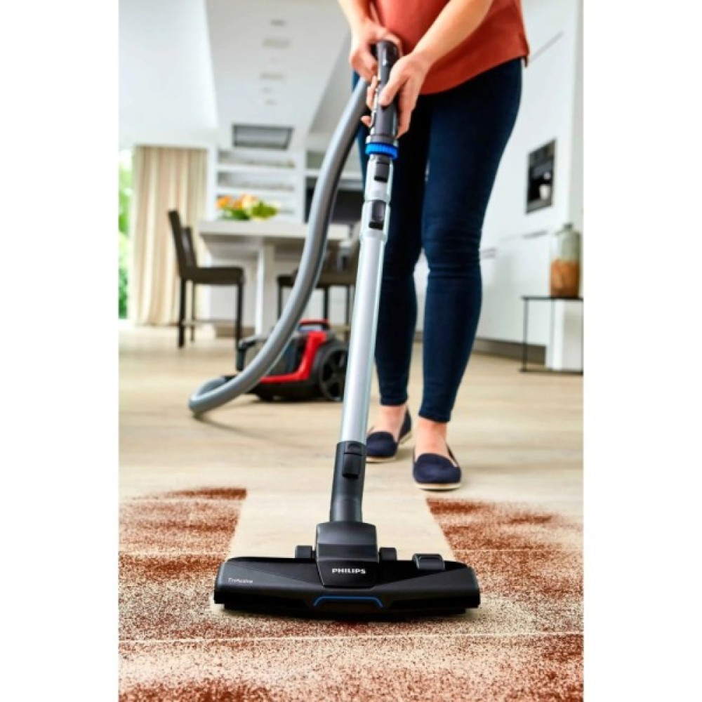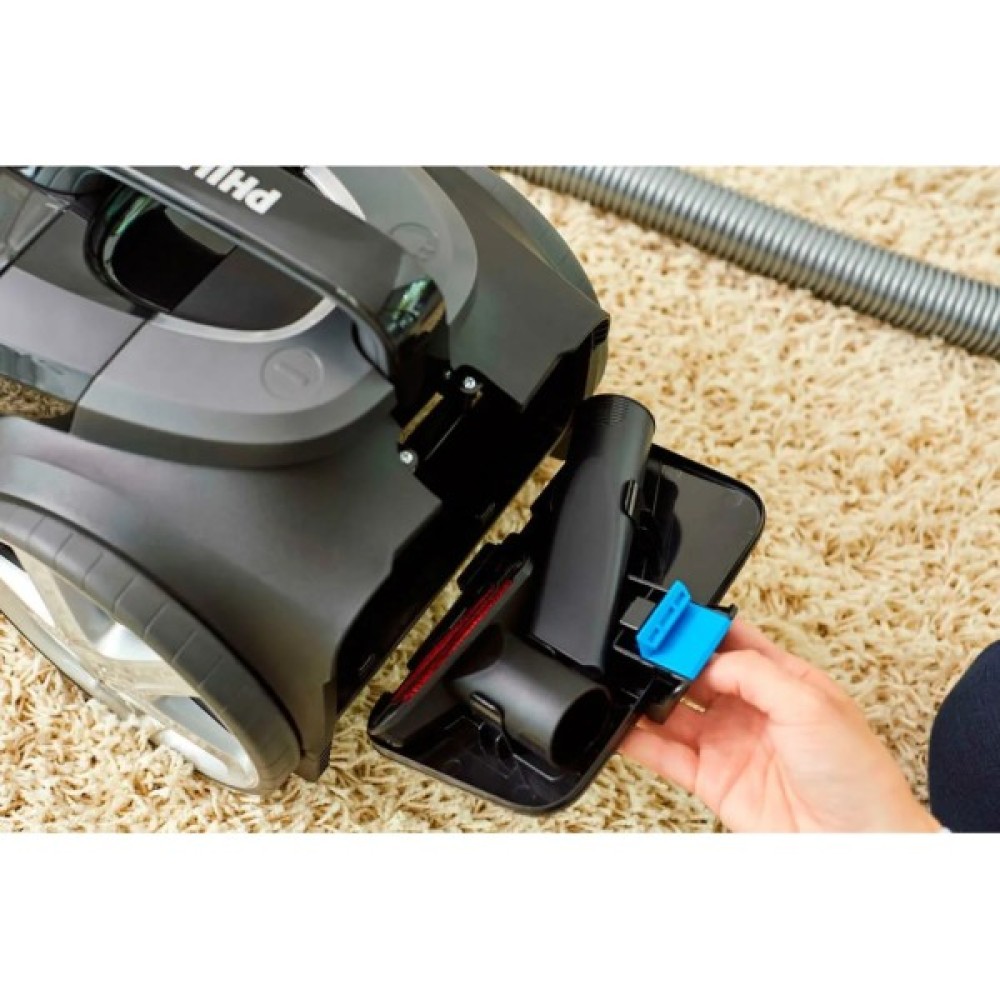 Оснащений насадкою TriActive, пилосос виконує три дії одночасно, роблячи прибирання ефективним та всебічним. Ця спеціальна насадка ретельно очищає килимові покриття, всмоктує великі частки через передній отвір, а також збирає пил уздовж стін і меблів. Ергономічна конструкція дозволяє зберігати аксесуари безпосередньо в корпусі, забезпечуючи легкий доступ та зручність під час роботи.
