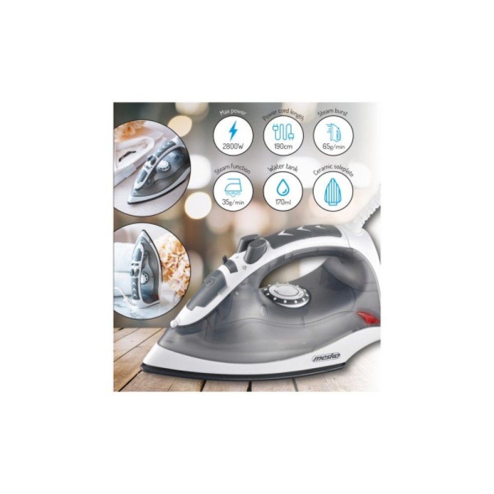 Праска Mesko - це практична і потужна праска з керамічною підошвою, яка дозволяє прасувати вертикально. Це сучасний пристрій з елегантним сірим корпусом, який має максимальну потужність 2800 Вт. Завдяки керамічній підошві праска легко ковзає по поверхні тканини, забезпечуючи комфорт для користувача. Керамічне покриття пілошви праски є стійкою до подряпин, тому ви не мусите боятися прасувати околиці ґудзиків або блискавок. Використання парового удару дозволяє позбутися навіть найбільш важких зморшок. Резервуар для води має ємність 170 мл, тому вистачить на випрасування одягу всієї родини. Праска Mesko також має 2-ступеневе регулювання постійного потоку пари. Праска Mesko - це ідеальний помічник для вашого дому.