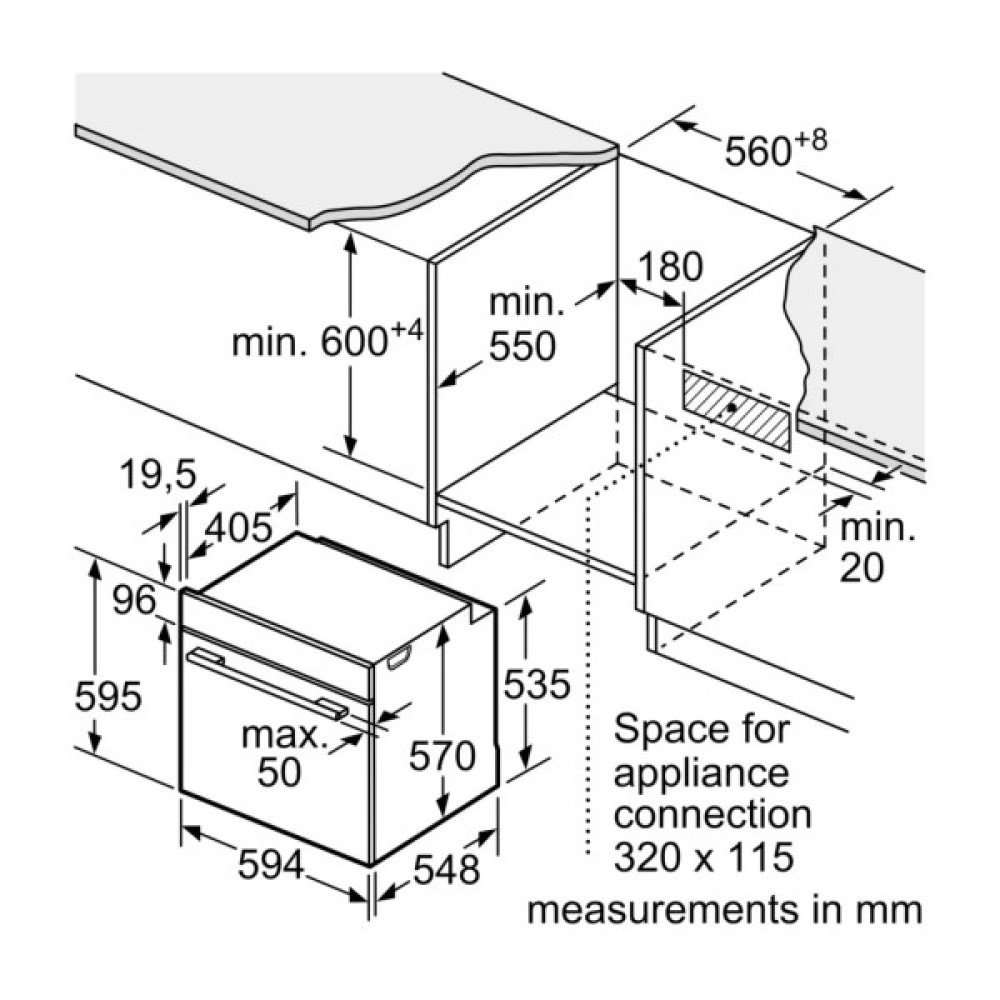 Загальні габарити духової шафи складають 595 x 594 x 548 мм, що дозволяє легко інтегрувати її у кухонний простір. Розмір ніші для вбудовування варіюється від 585 до 595 мм у ширину, від 560 до 568 мм у висоту та 550 мм у глибину, забезпечуючи гнучкість у встановленні.