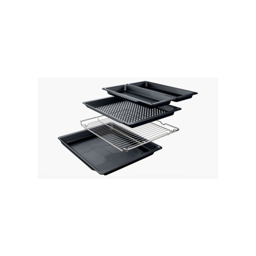 Сенсорне керування дозволяє легко налаштовувати параметри приготування, а наявність трьох скляних дверцят духовки забезпечує ефективну теплоізоляцію. Решітчасті та дротові направляючі, разом із телескопічними, додають зручності у користуванні. У комплекті з духовкою ви отримаєте грати, глибоке та дрібне деко, деко Air-Fry, а також дві пари телескопічних напрямних.