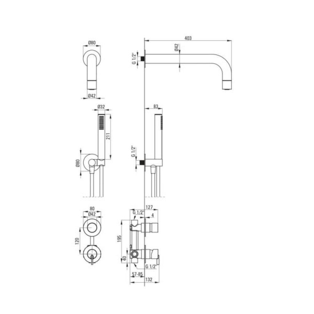 Комплектація ручна лійка; тримач для душу; верхній душ; змішувач; душовий шланг; перемикач